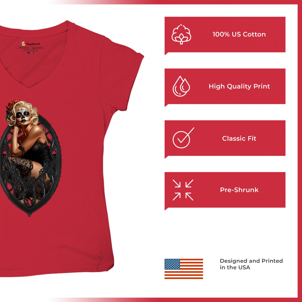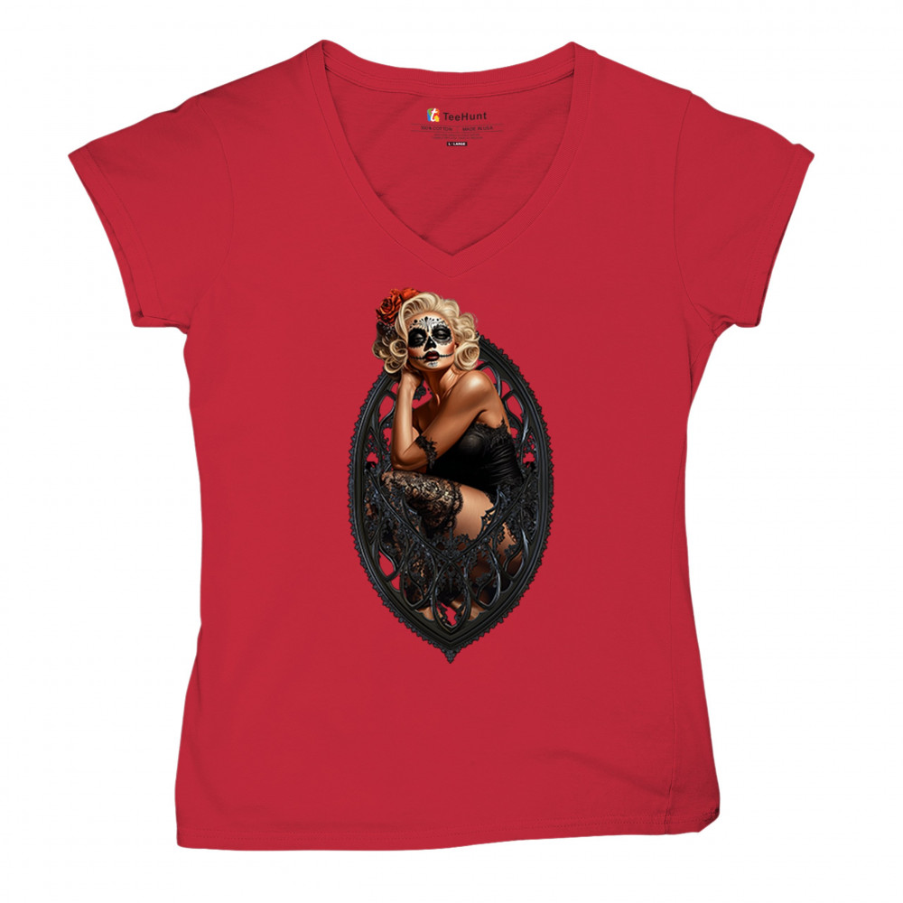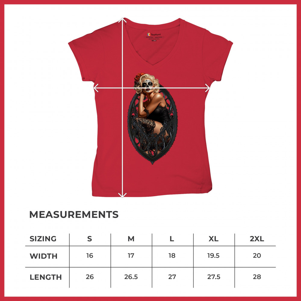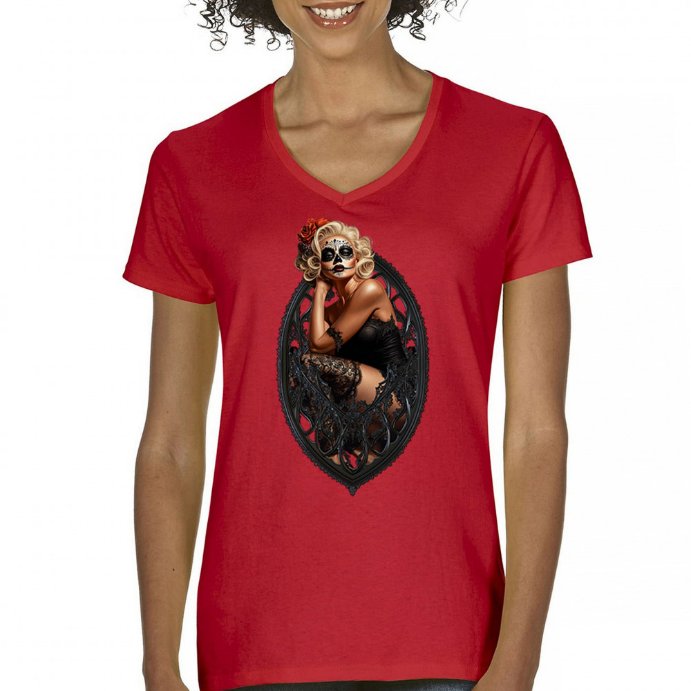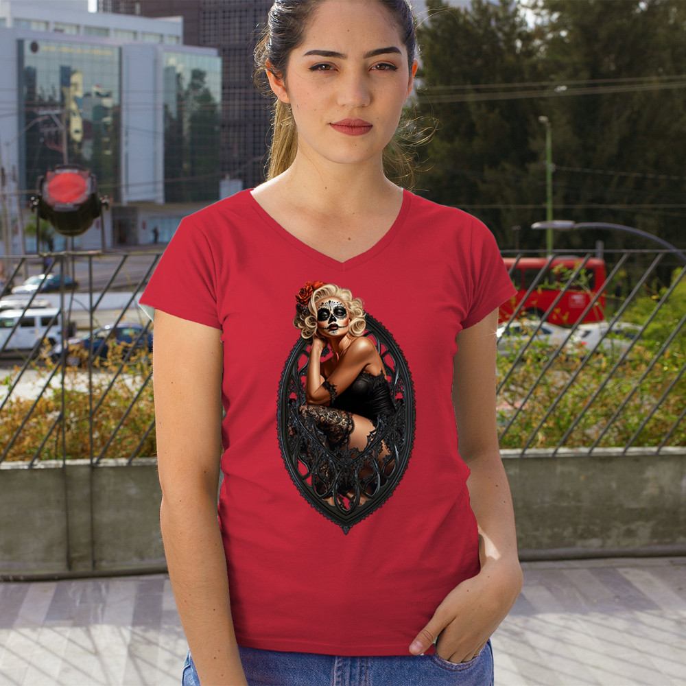 This sultry sugar skull pinup design blends gothic lace, seductive pose, and ornate frame detail for a bold Day of the Dead tribute. With striking makeup and vintage lingerie styling, it’s perfect for fans of macabre fashion, calavera art, and dark romance. A hauntingly beautiful mix of allure, attitude, and Dia de los Muertos charm.