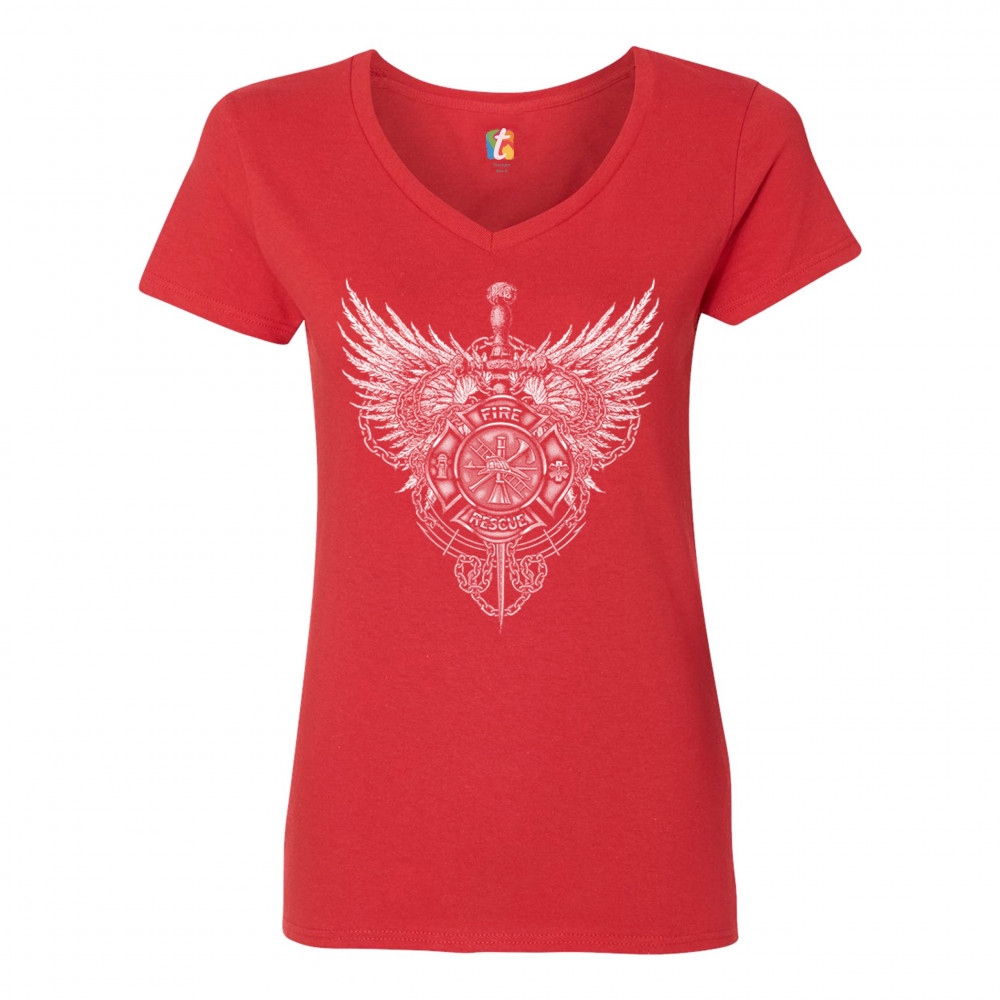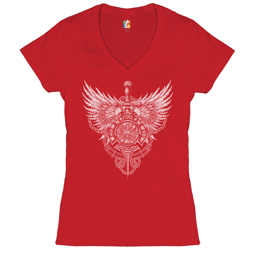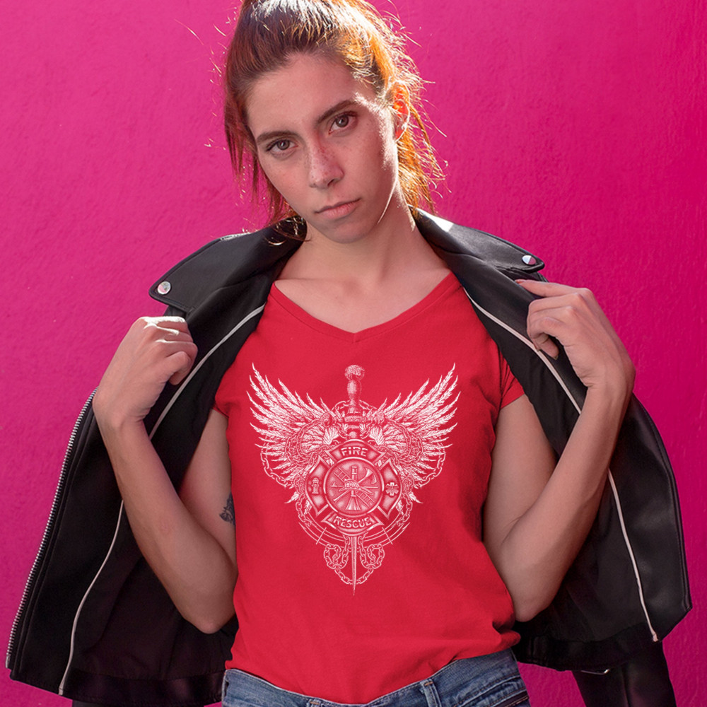 GOTHIC FIREFIGHTER EMBLEM women's v-neck t-shirt courage honor sacrifice tee red