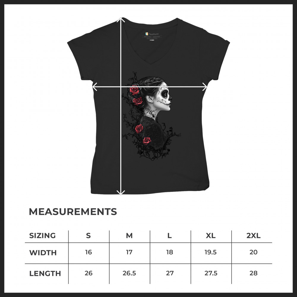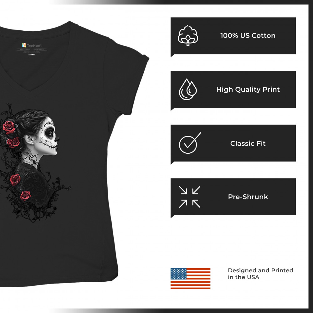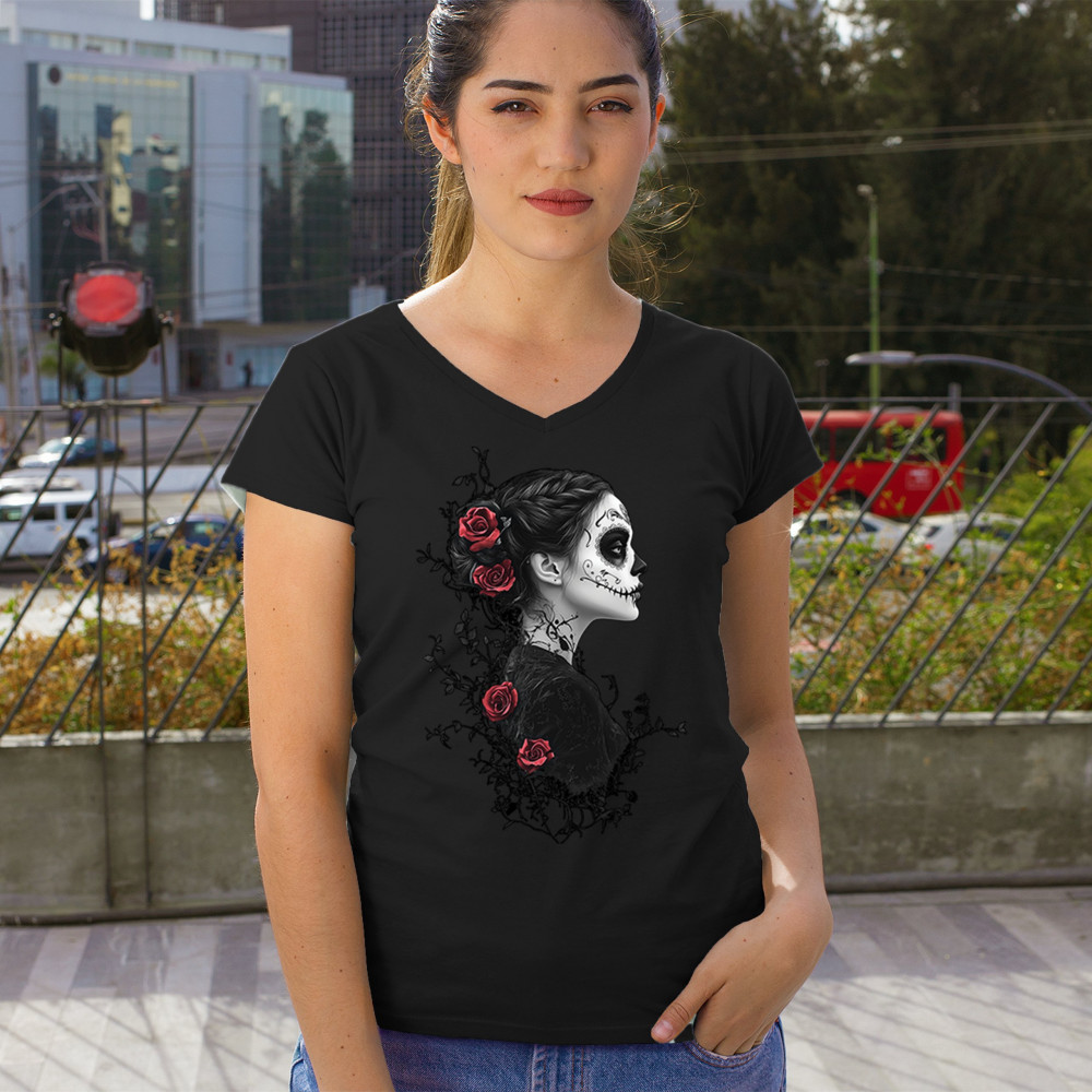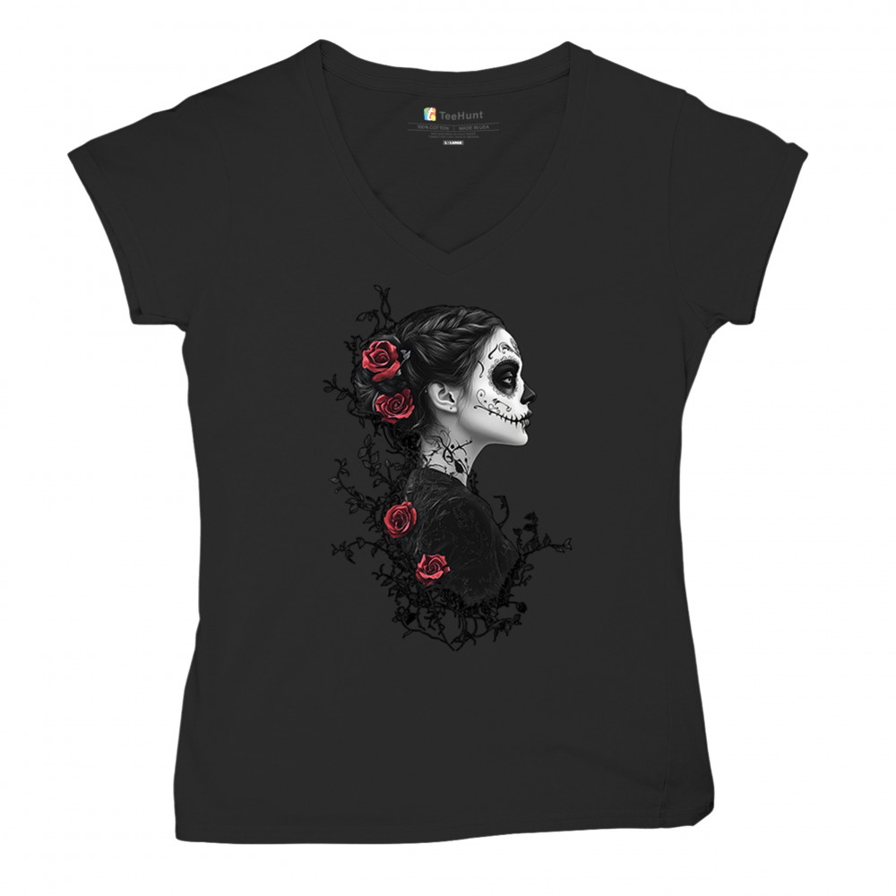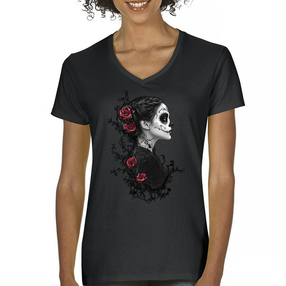 GOTHIC SUGAR SKULL ROSES women's v-neck t-shirt day of dead dark elegance tee black