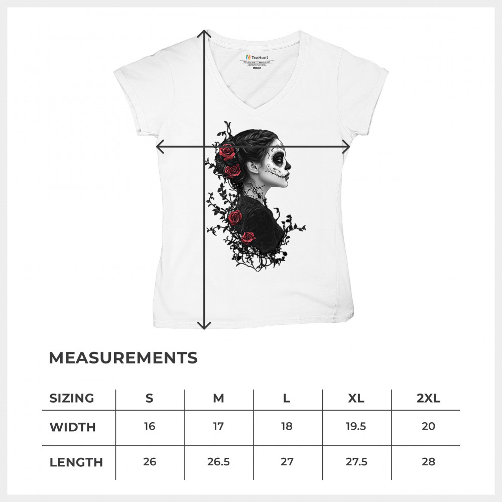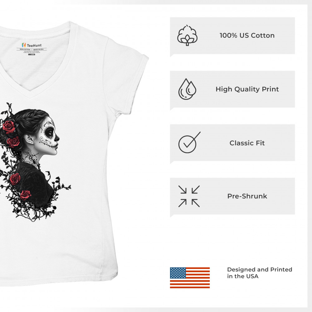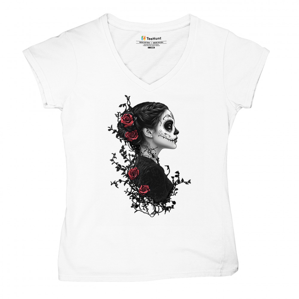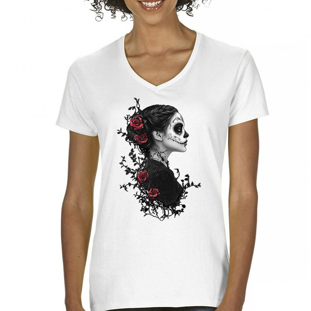 Celebrate Dia de los Muertos in style with this refined sugar skull woman design. Featuring a side profile view, vibrant red roses, and dark gothic floral elements, it creates a graceful balance between mystery and beauty. Ideal for fans of macabre art, skull themes, and honoring ancestral traditions through elegant visuals.