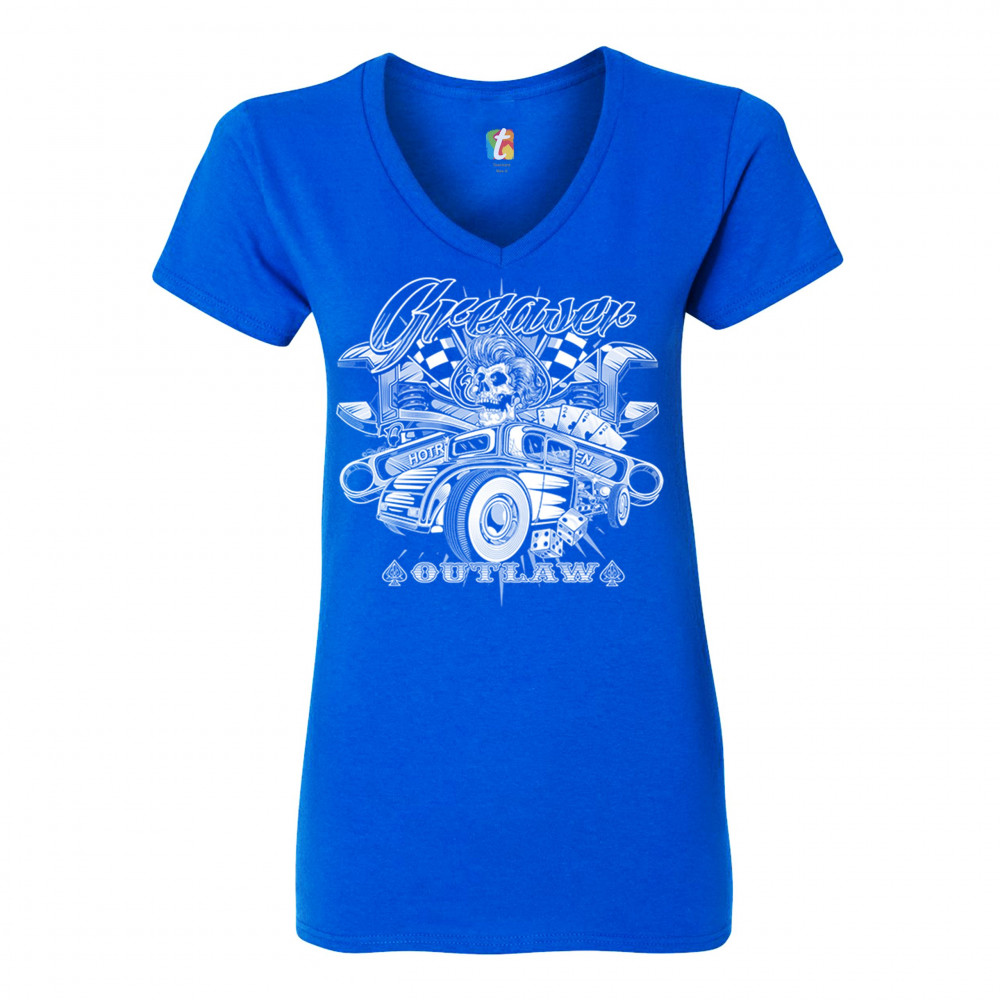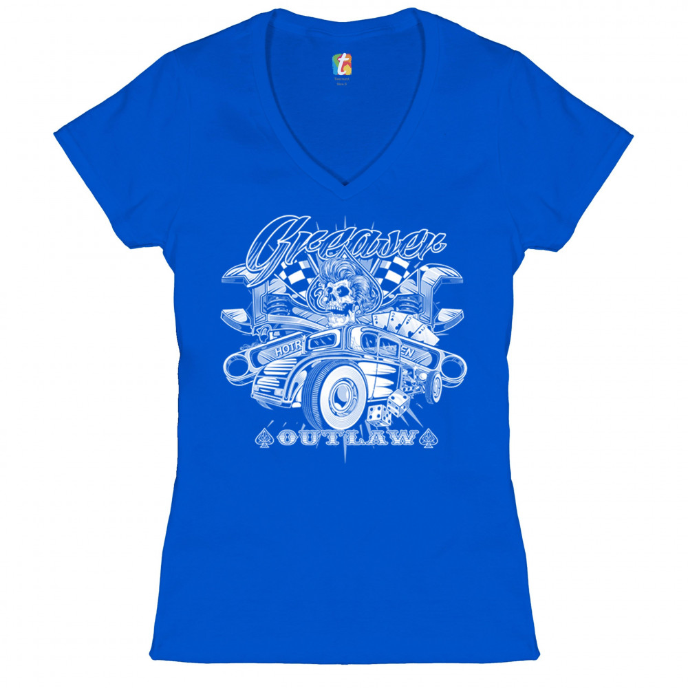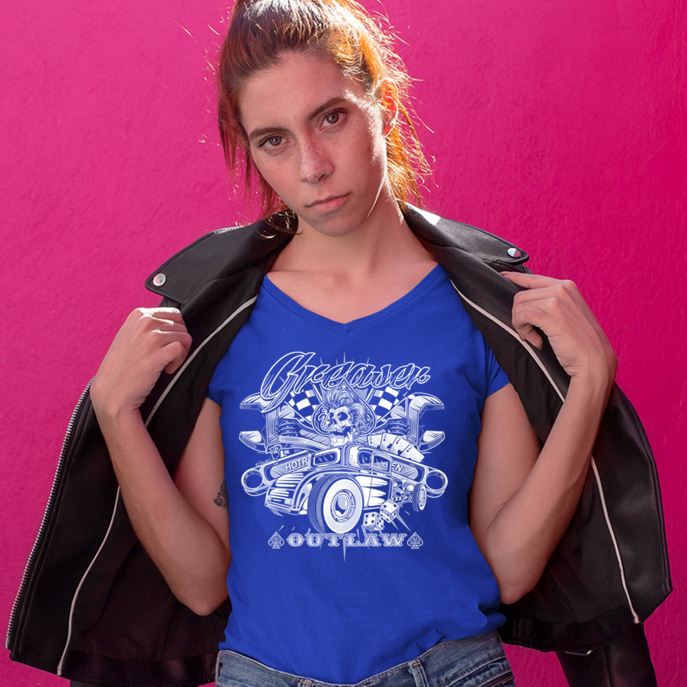 GREASER OUTLAW women's v-neck t-shirt kustom kulture old school hot rod tee royal blue