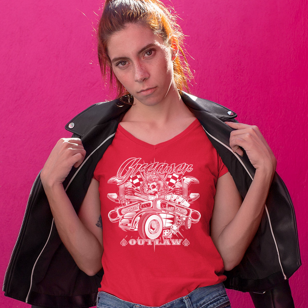 A print featuring a skull, a vintage Hot Rod and a pair of dice. In the background there are crossed wrenches, playing cards and racing flags. The print says: "Greaser outlaw". A great choice for a fan of customized American classic cars and hot rods.