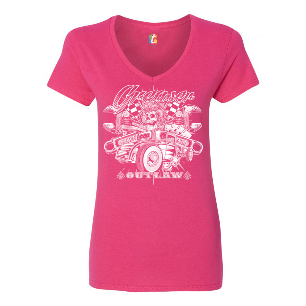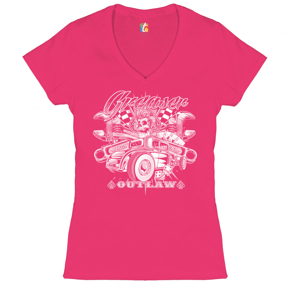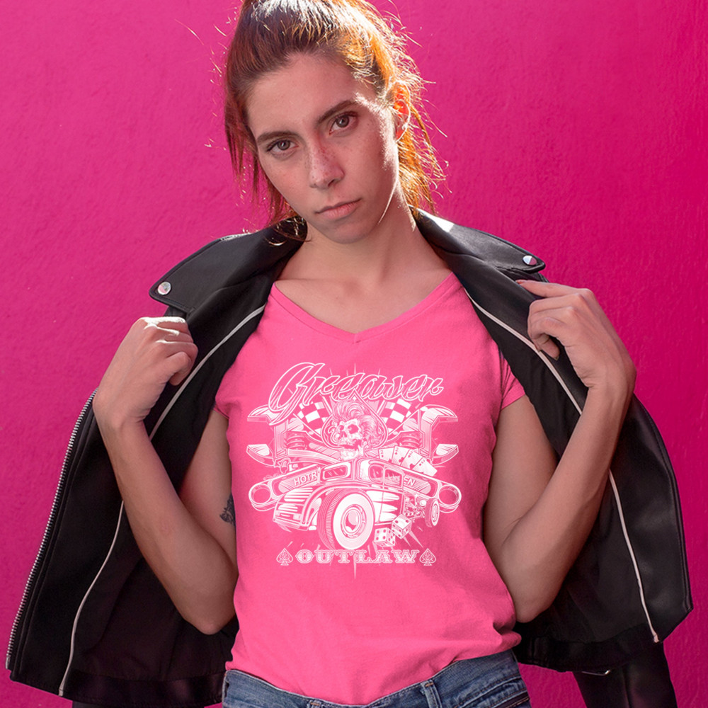 A print featuring a skull, a vintage Hot Rod and a pair of dice. In the background there are crossed wrenches, playing cards and racing flags. The print says: "Greaser outlaw". A great choice for a fan of customized American classic cars and hot rods.