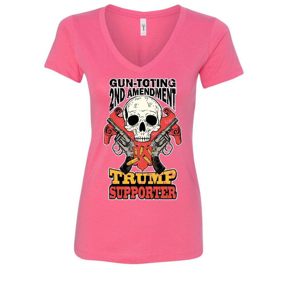 GUN-TOTING 2ND AMENDMENT TRUMP SUPPORTER gun-toting trump supporter women's v-neck t-shirt 2nd amendment skull revolvers pink
