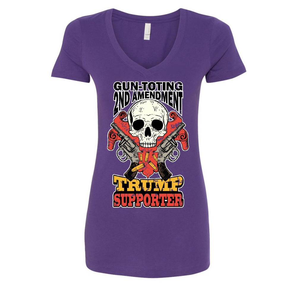 GUN-TOTING 2ND AMENDMENT TRUMP SUPPORTER gun-toting trump supporter women's v-neck t-shirt 2nd amendment skull revolvers purple