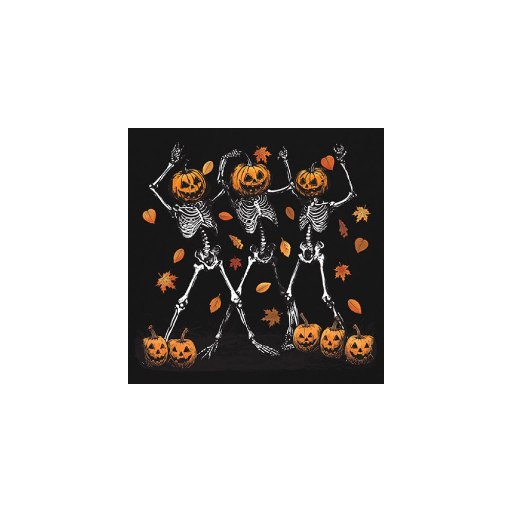 Celebrate Halloween in style with this dancing skeleton and pumpkin design, perfect for parties and fall festivals.