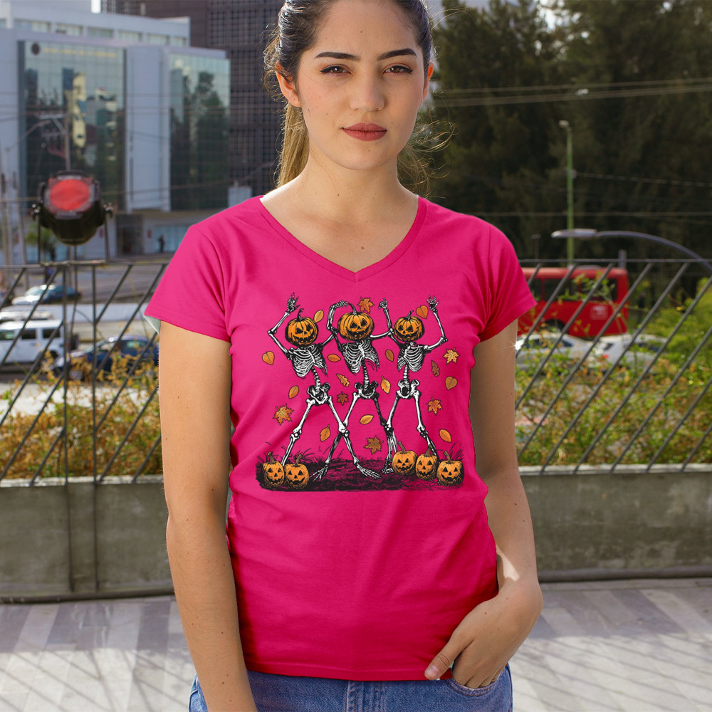 Add a touch of spooky fun to your wardrobe with this lively design featuring pumpkin-headed skeletons dancing through a swirl of autumn leaves. Perfect for Halloween parties, trick-or-treating, and fall festivals, this design is a must-have for anyone who enjoys the whimsical side of the spooky season. Made with comfort and quality in mind, this is the perfect apparel for all your October gatherings and events. Wear it to show off your Halloween spirit!