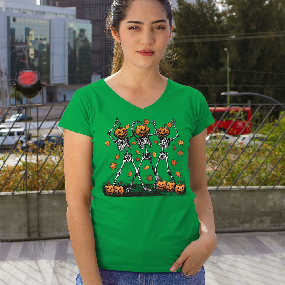 Add a touch of spooky fun to your wardrobe with this lively design featuring pumpkin-headed skeletons dancing through a swirl of autumn leaves. Perfect for Halloween parties, trick-or-treating, and fall festivals, this design is a must-have for anyone who enjoys the whimsical side of the spooky season. Made with comfort and quality in mind, this is the perfect apparel for all your October gatherings and events. Wear it to show off your Halloween spirit!