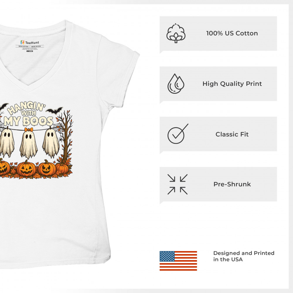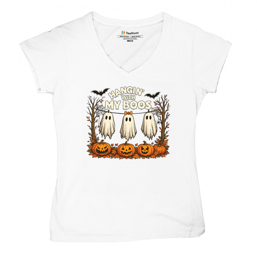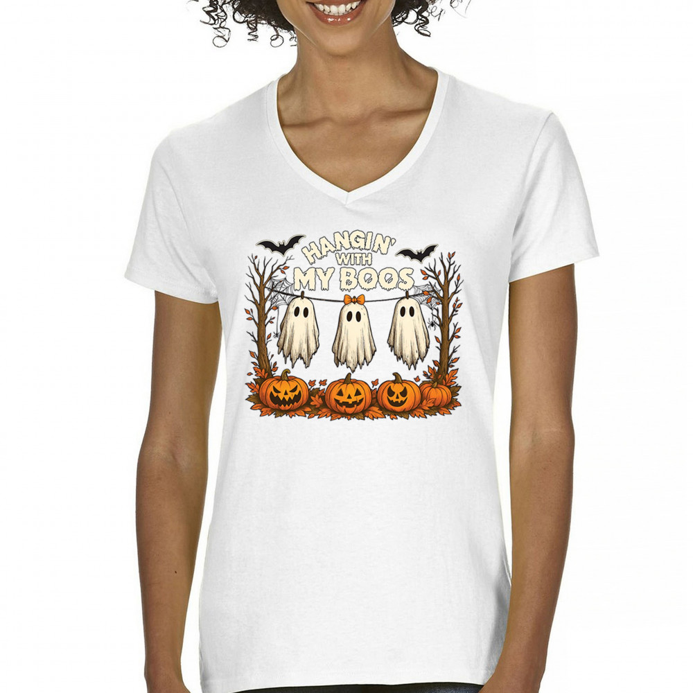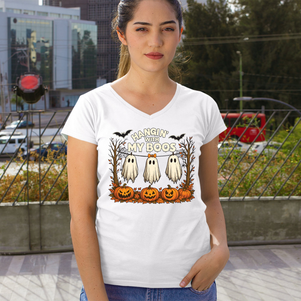 Hangin With My Boos design featuring spooky ghosts, jack o lanterns, and haunted house humor. Perfect for Halloween night, October 31, and parties.