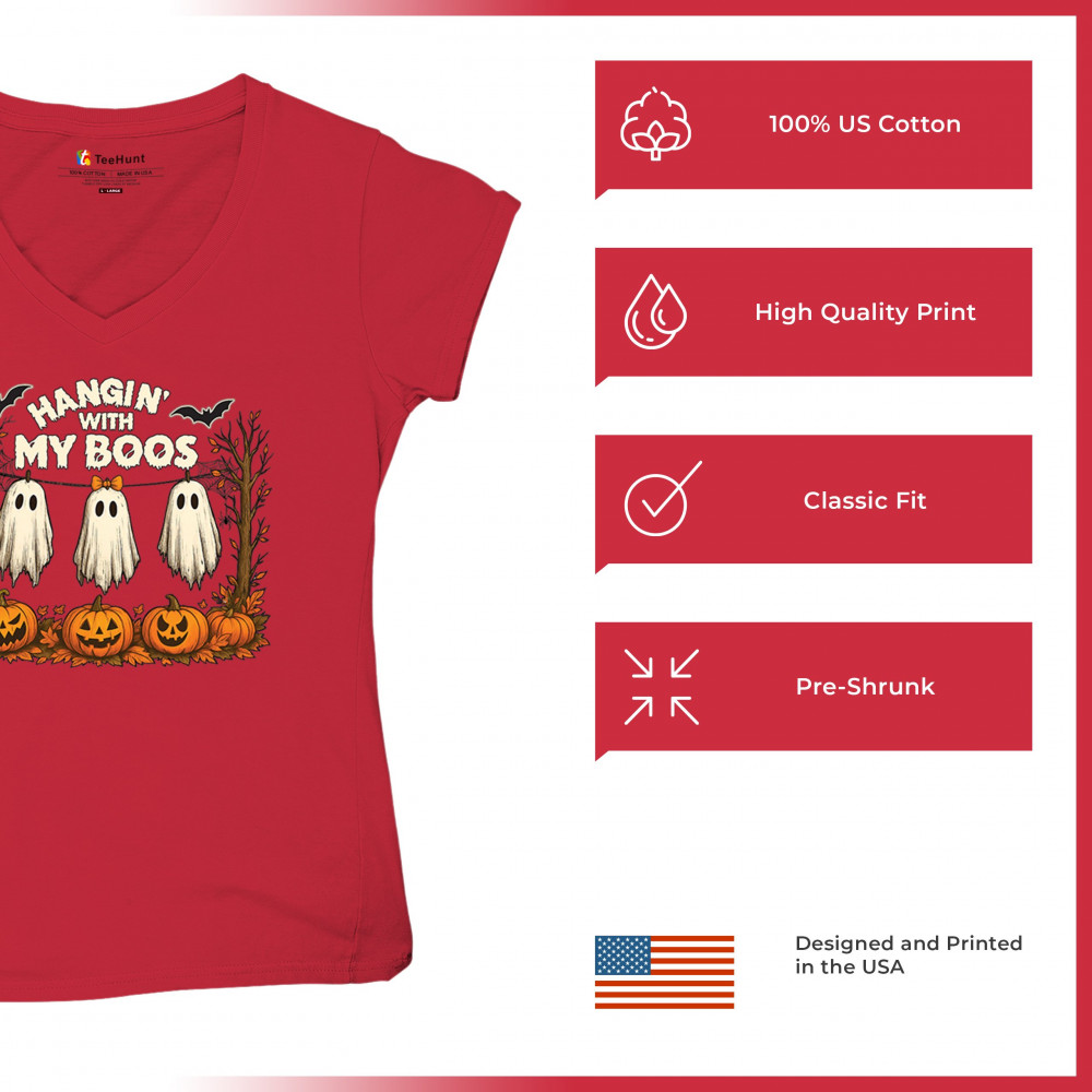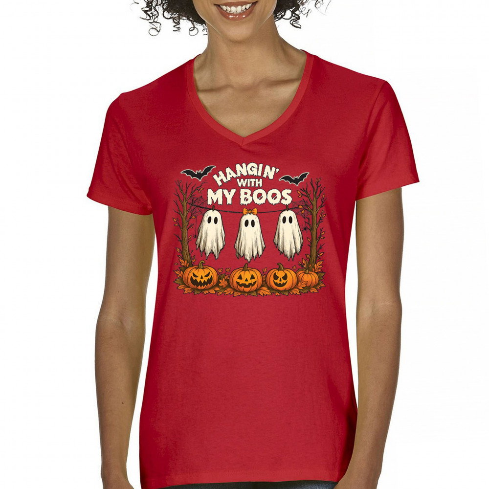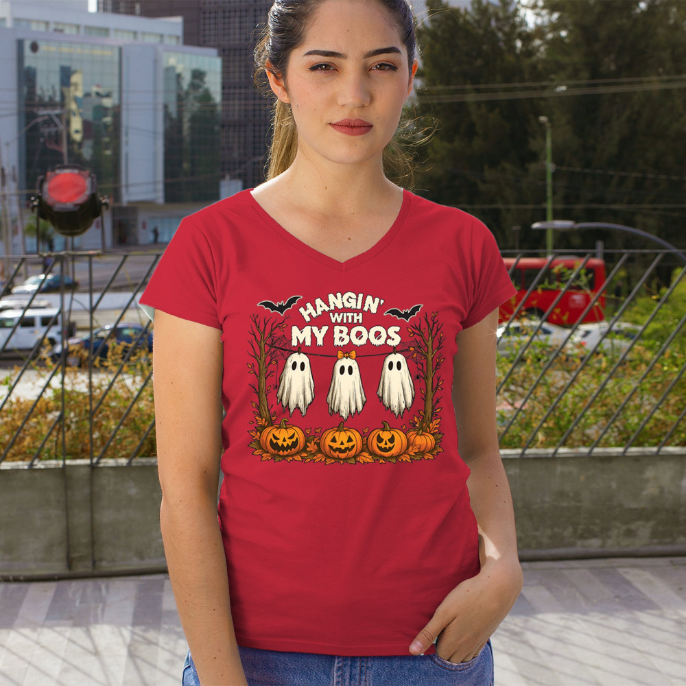 Hangin With My Boos design featuring spooky ghosts, jack o lanterns, and haunted house humor. Perfect for Halloween night, October 31, and parties.