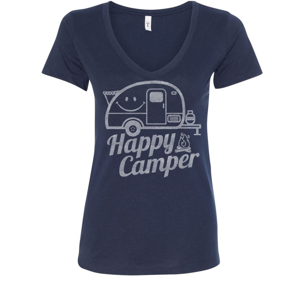 HAPPY CAMPER women's v-neck t-shirt rv tourism camping summer nature travel navy blue