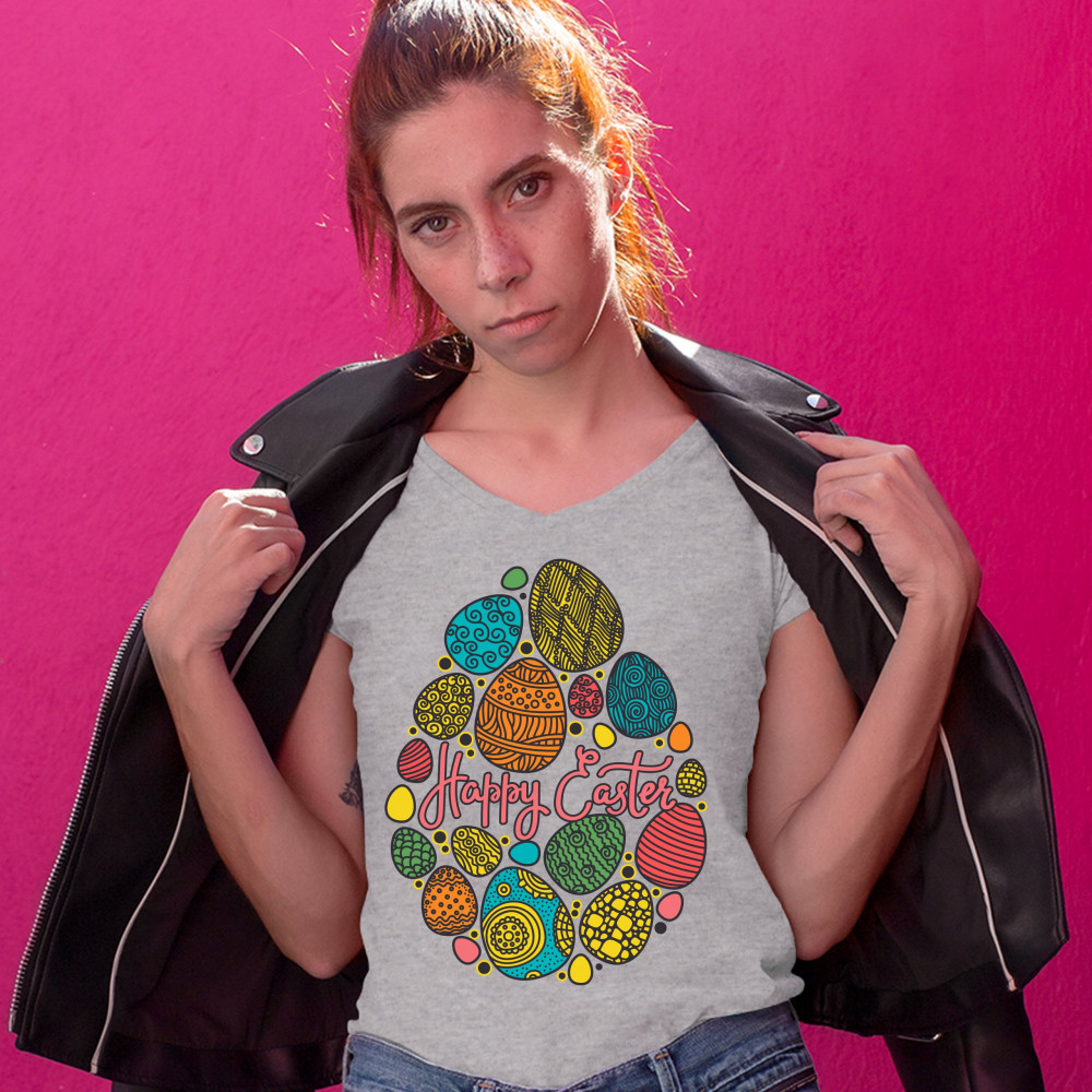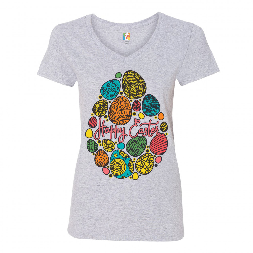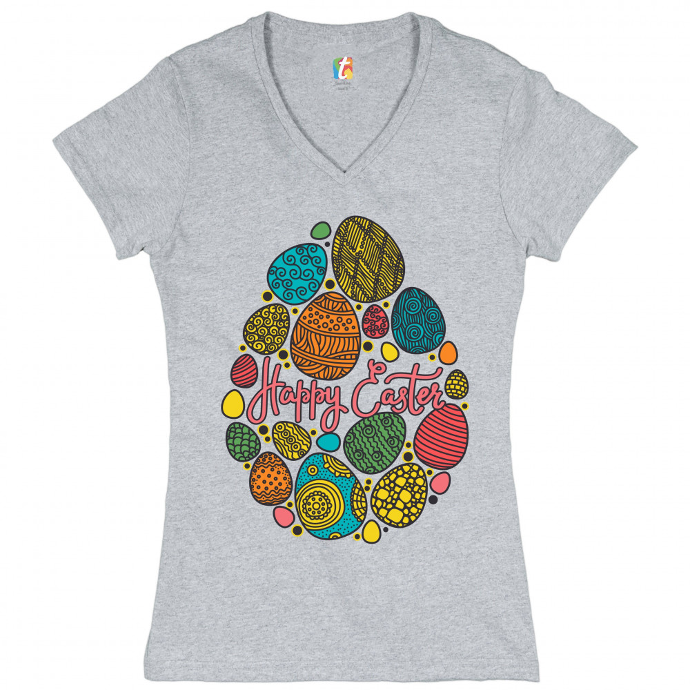 HAPPY EASTER women's v-neck t-shirt pascha easter eggs jesus ressurection tee gray