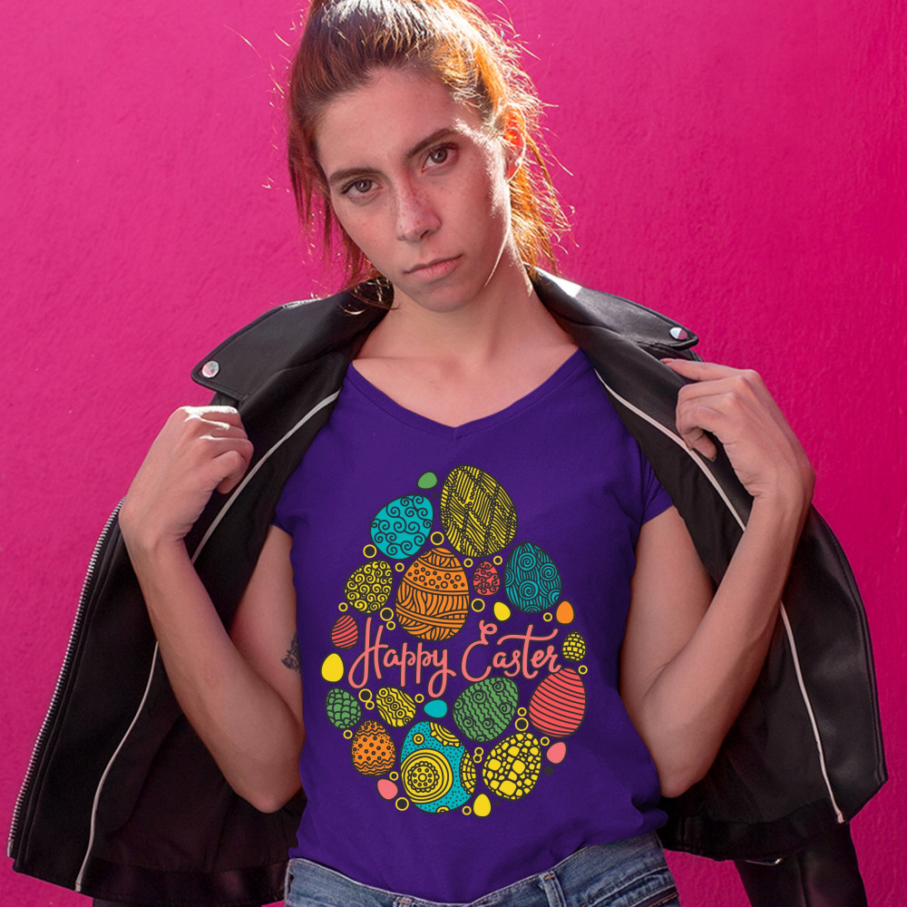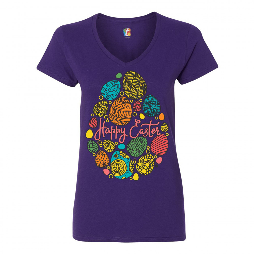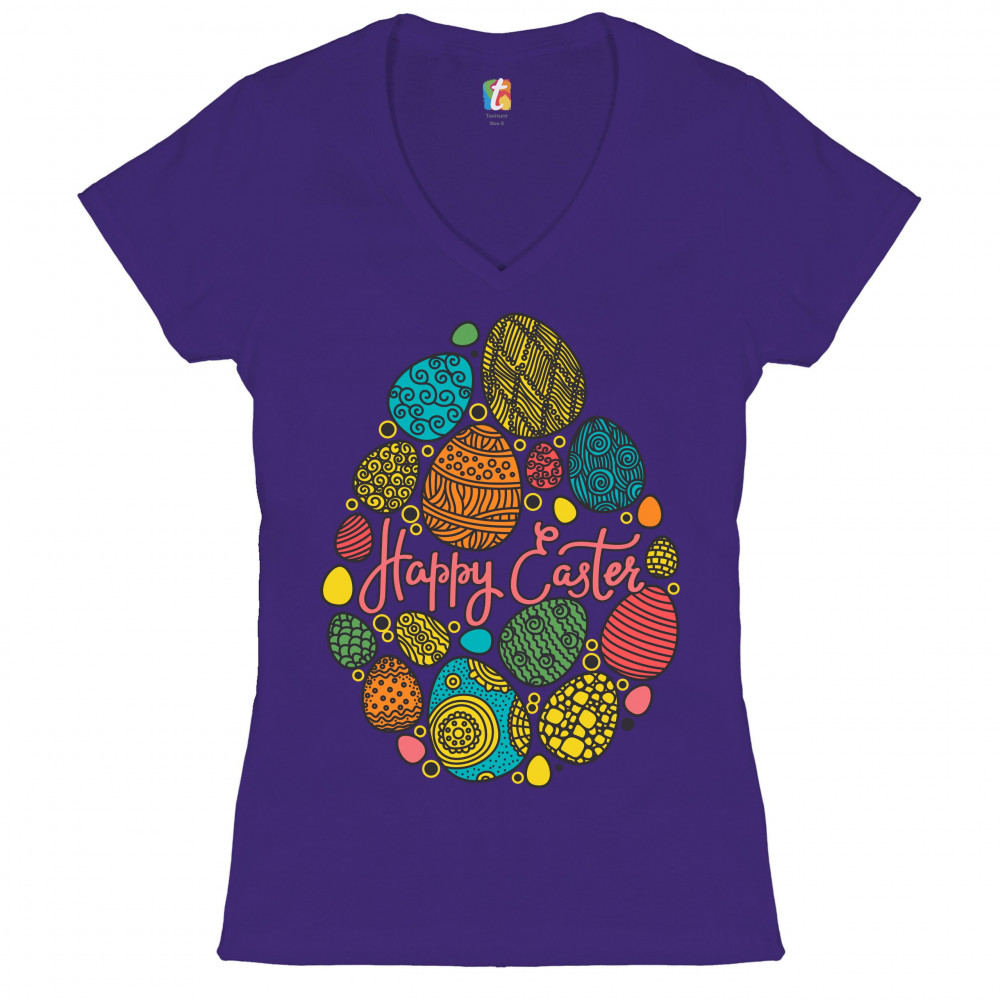 HAPPY EASTER women's v-neck t-shirt pascha easter eggs jesus ressurection tee purple