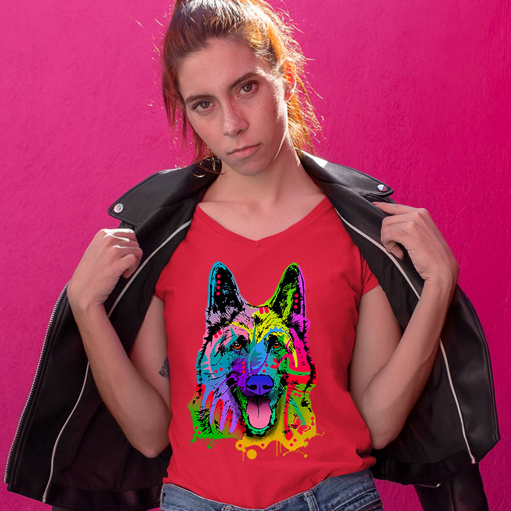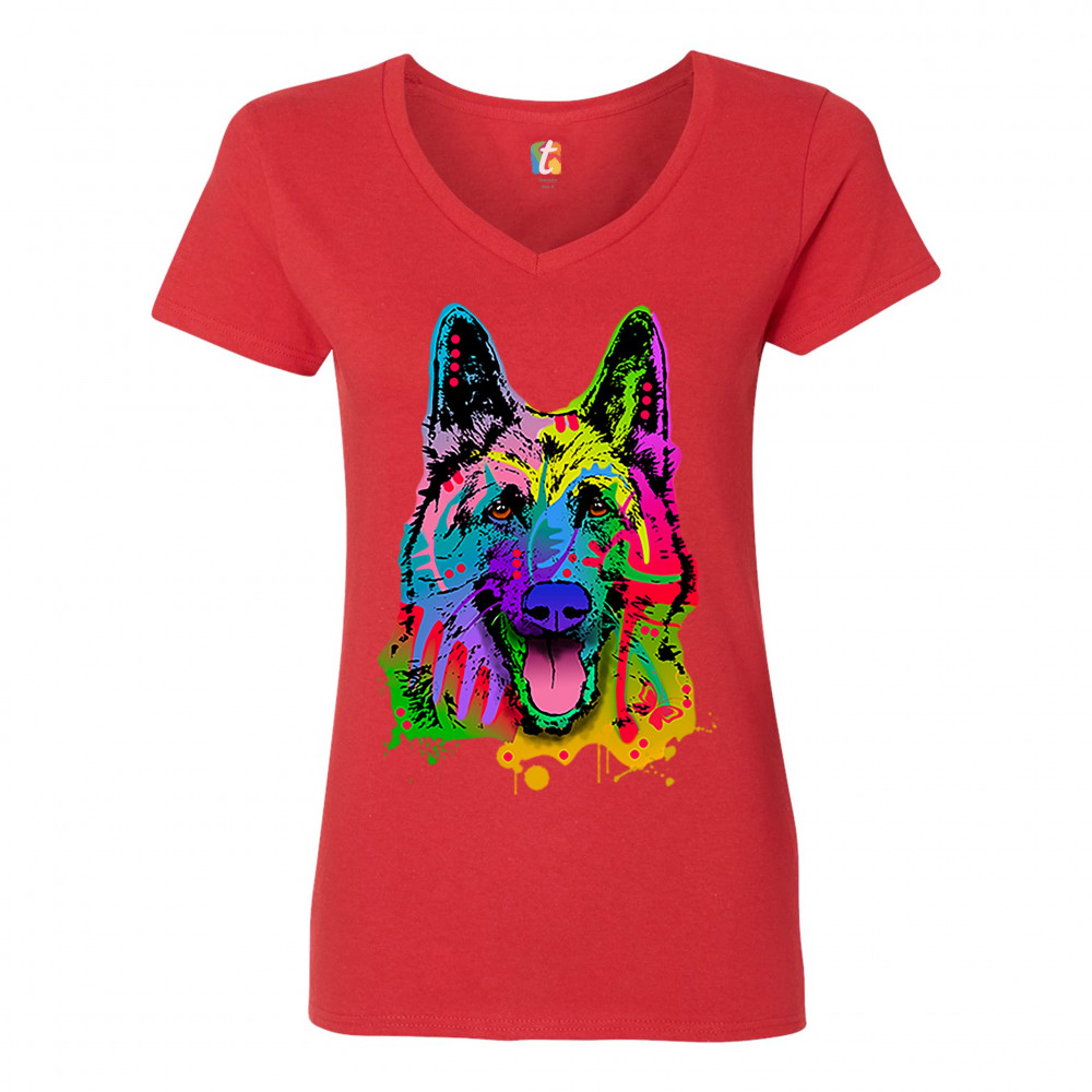 HAPPY GERMAN SHEPHERD women's v-neck t-shirt andy maxx i love my dog tee red