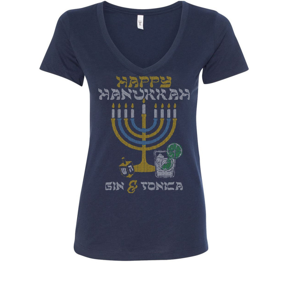 HAPPY HANUKKAH GIN & TONICA happy hanukkah women's v-neck t-shirt menorah drinking gin & tonica dreidel navy blue