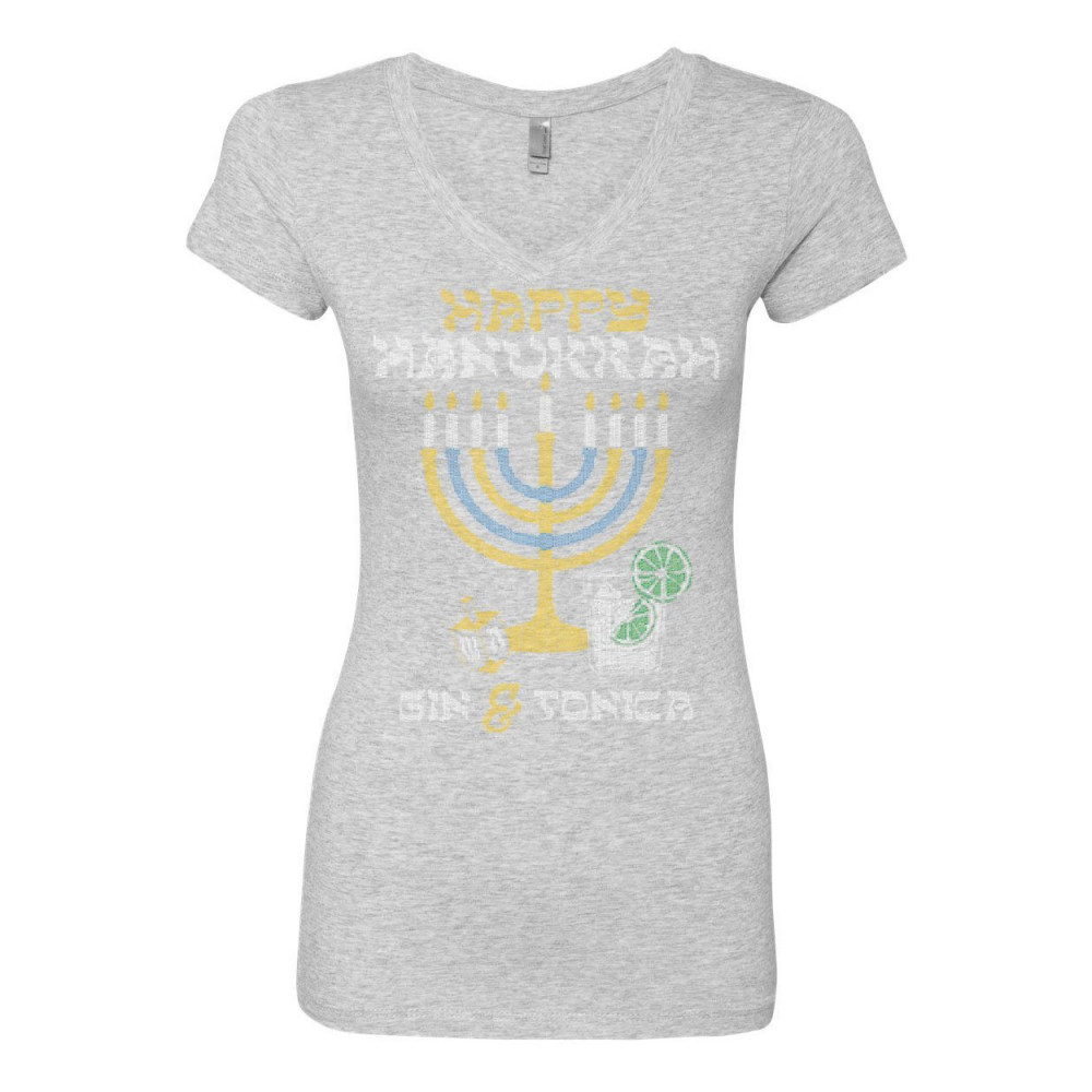 HAPPY HANUKKAH GIN & TONICA happy hanukkah women's v-neck t-shirt menorah drinking gin & tonica dreidel gray