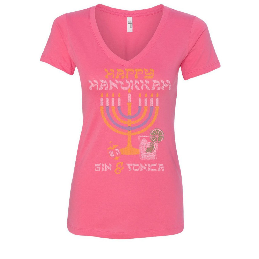 HAPPY HANUKKAH GIN & TONICA happy hanukkah women's v-neck t-shirt menorah drinking gin & tonica dreidel pink