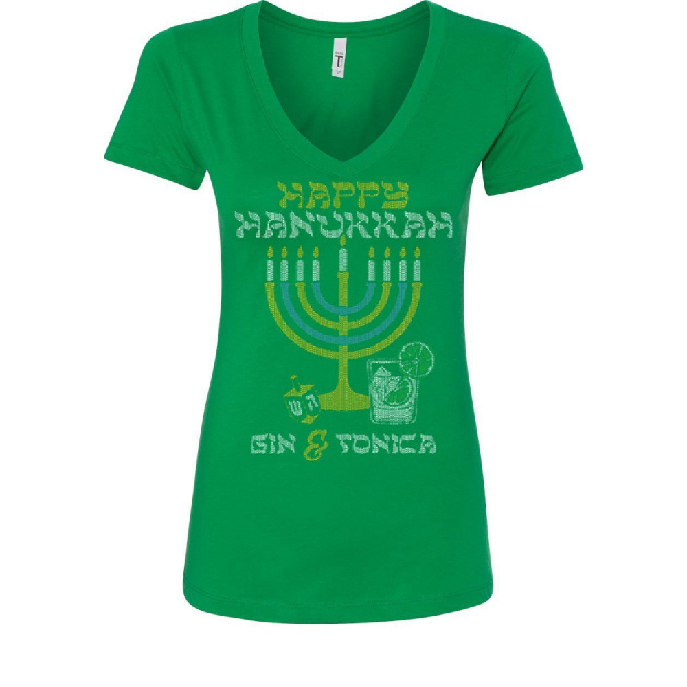 HAPPY HANUKKAH GIN & TONICA happy hanukkah women's v-neck t-shirt menorah drinking gin & tonica dreidel green