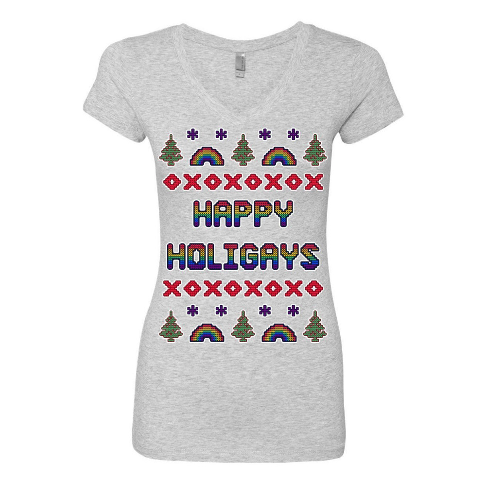 HAPPY HOLIGAYS women's v-neck t-shirt gay merry christmas ho ho ho lgbt xmas gray