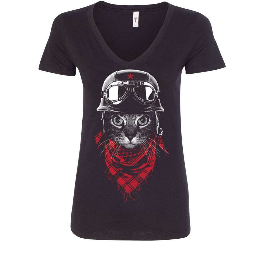 HARDCORE BIKER CAT women's v-neck t-shirt adventurer motorcycle rider kitten black