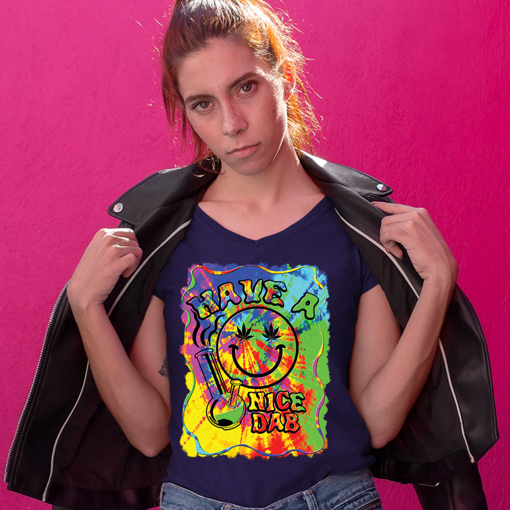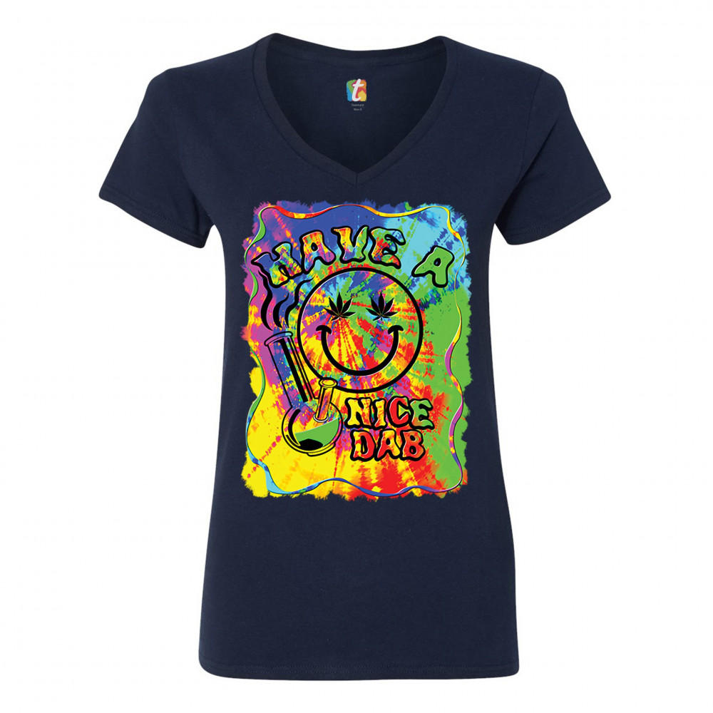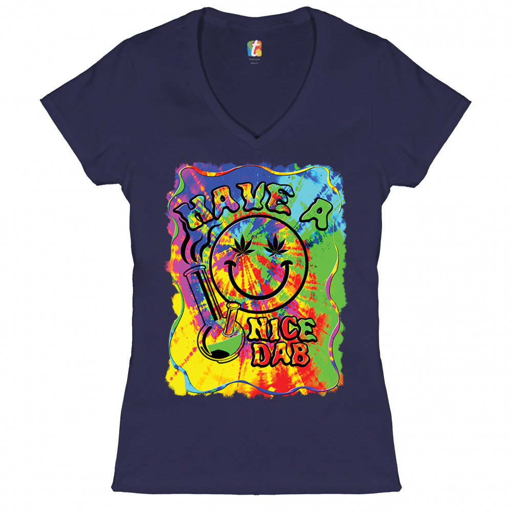 HAVE A NICE DAB women's v-neck t-shirt 420 happy face hitting a weed bong tee navy blue