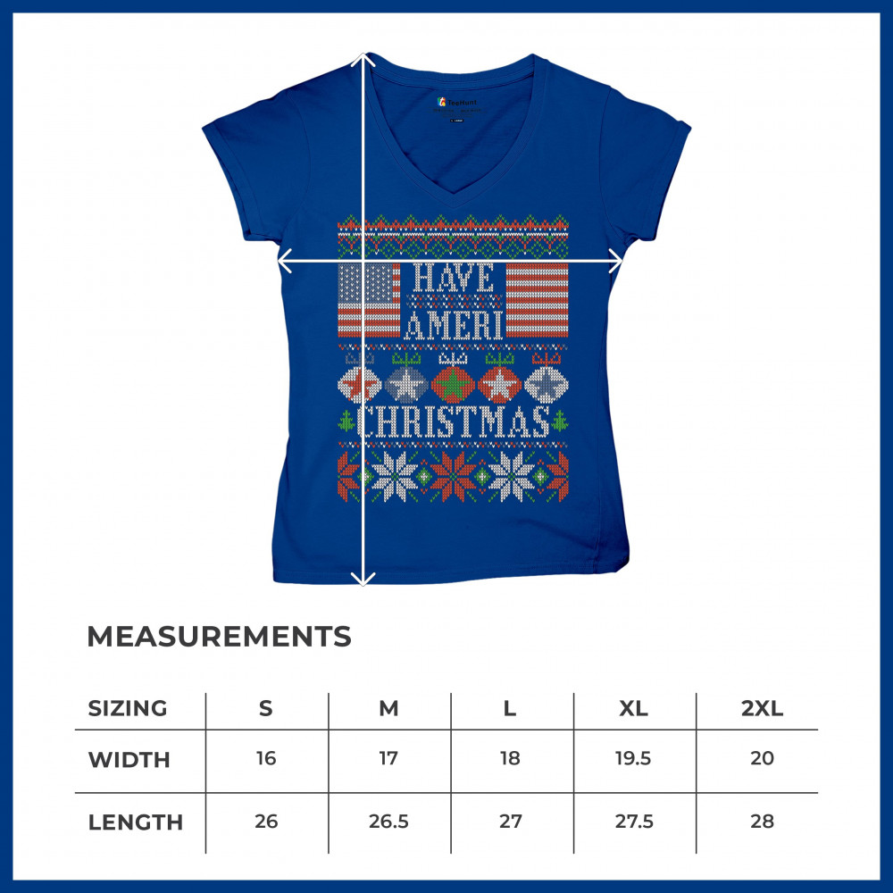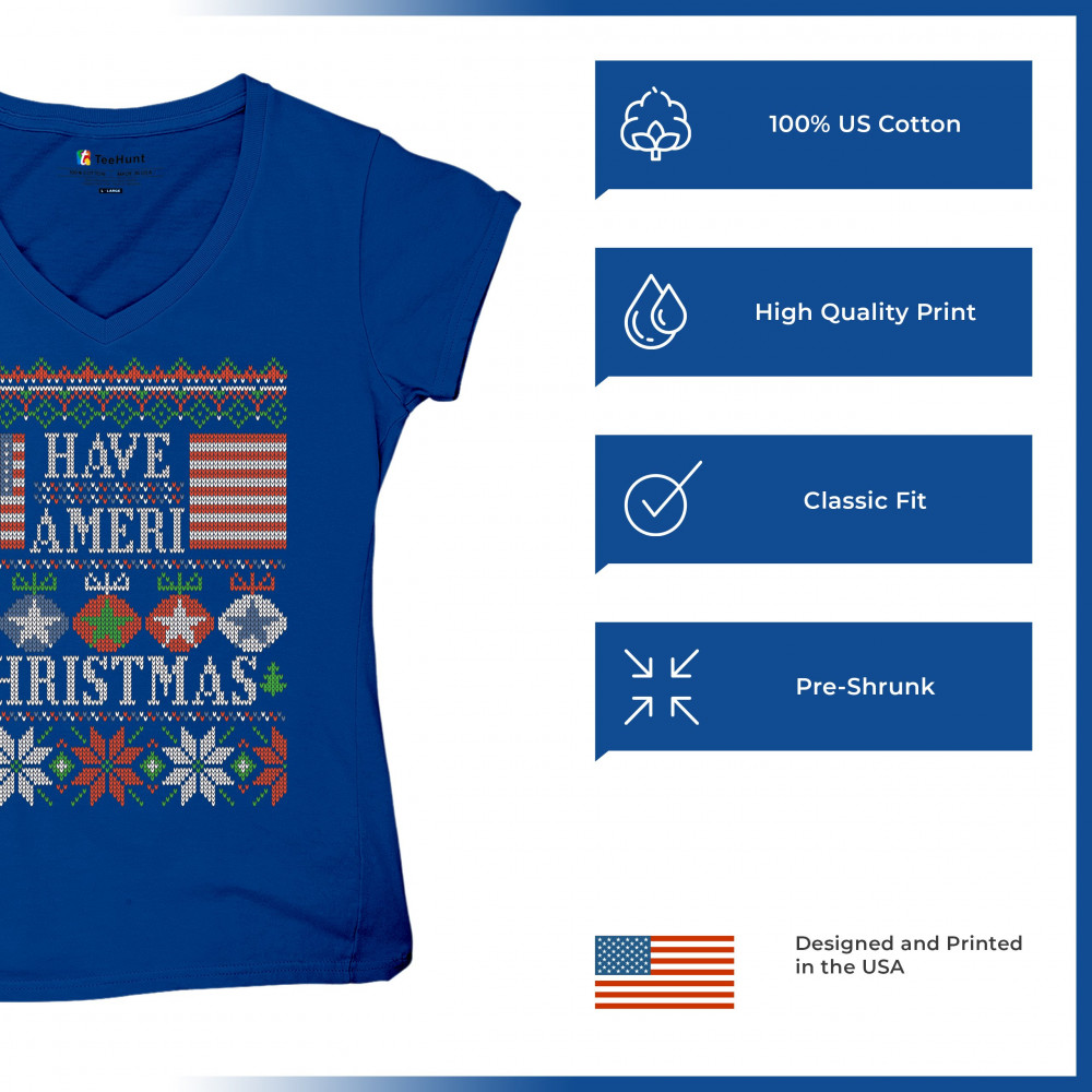 HAVE AMERI CHRISTMAS women's v-neck t-shirt american flag ugly sweater tee royal blue