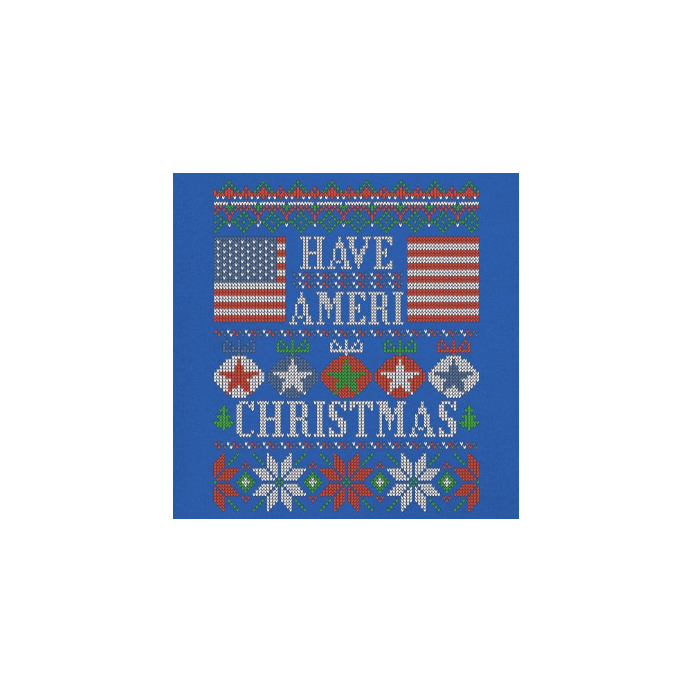 A print saying: "Have Ameri Christmas" and featuring an American flag and five Christmas bulbs. The print is designed as an ugly sweater. Amazing choice to express your patriotism while celebrating Christmas.