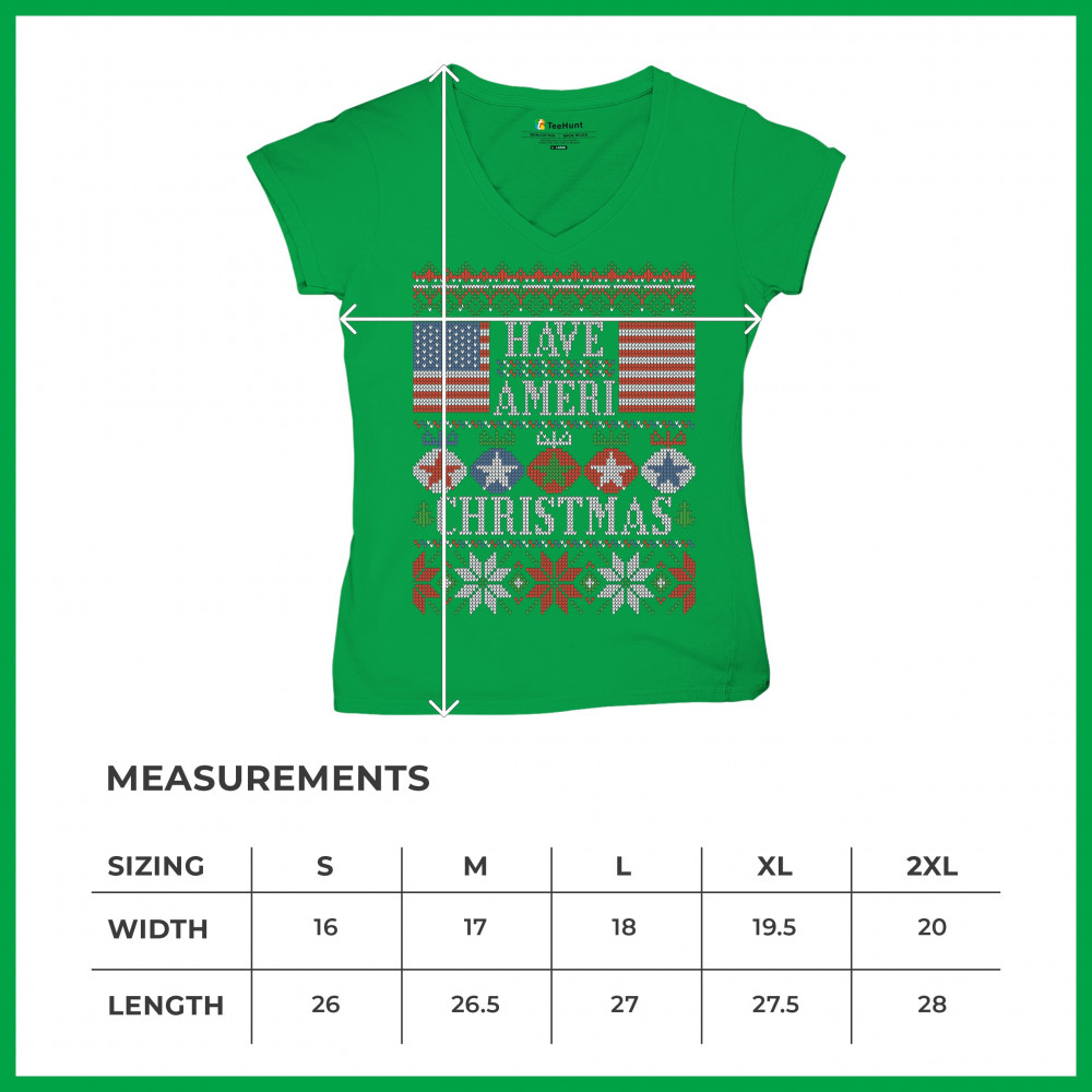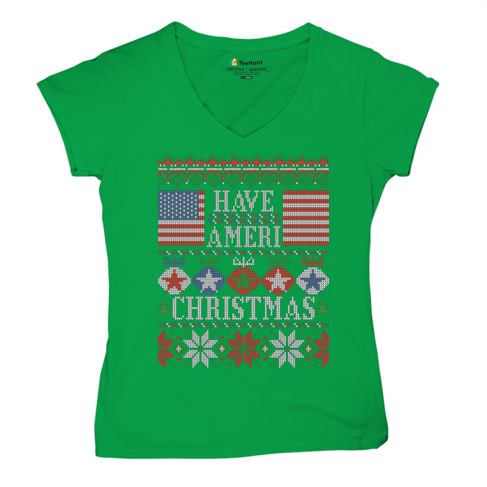 HAVE AMERI CHRISTMAS women's v-neck t-shirt american flag ugly sweater tee green