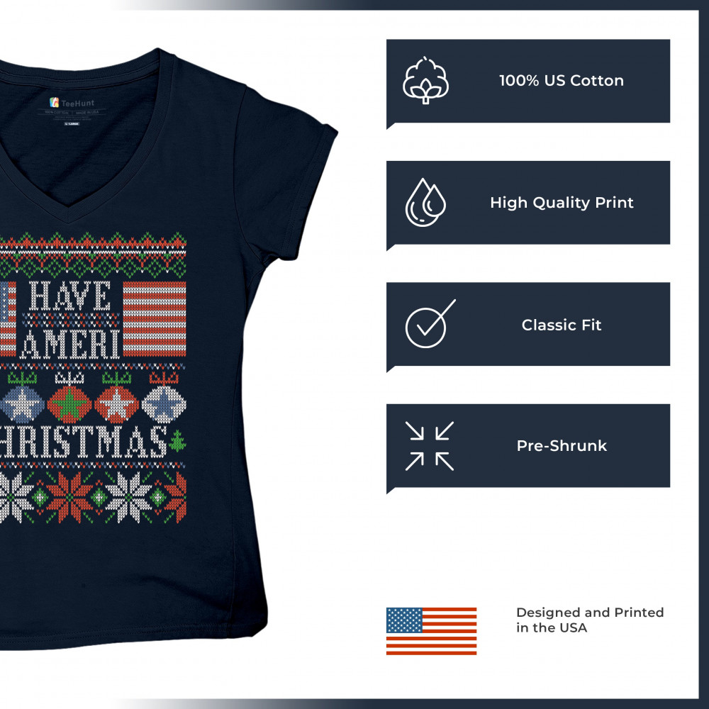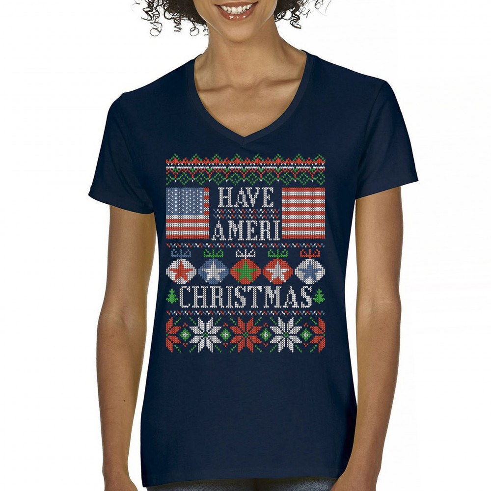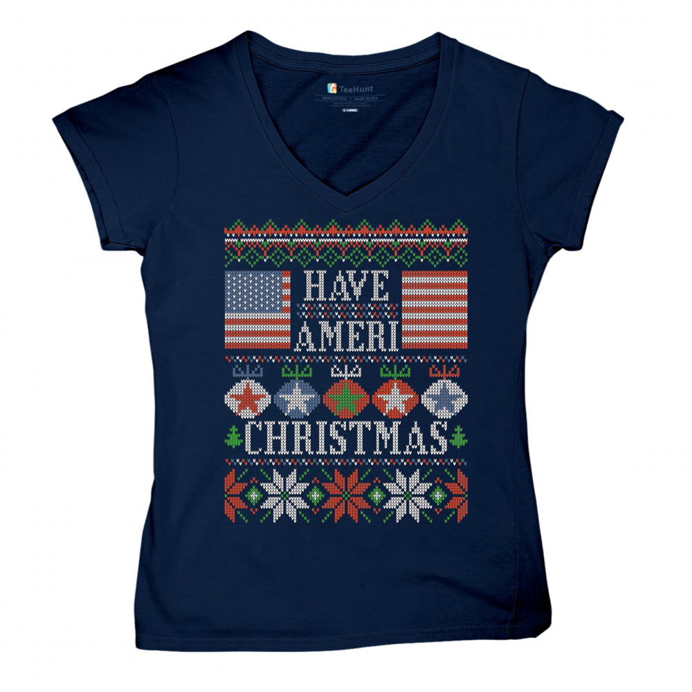 HAVE AMERI CHRISTMAS women's v-neck t-shirt american flag ugly sweater tee navy blue