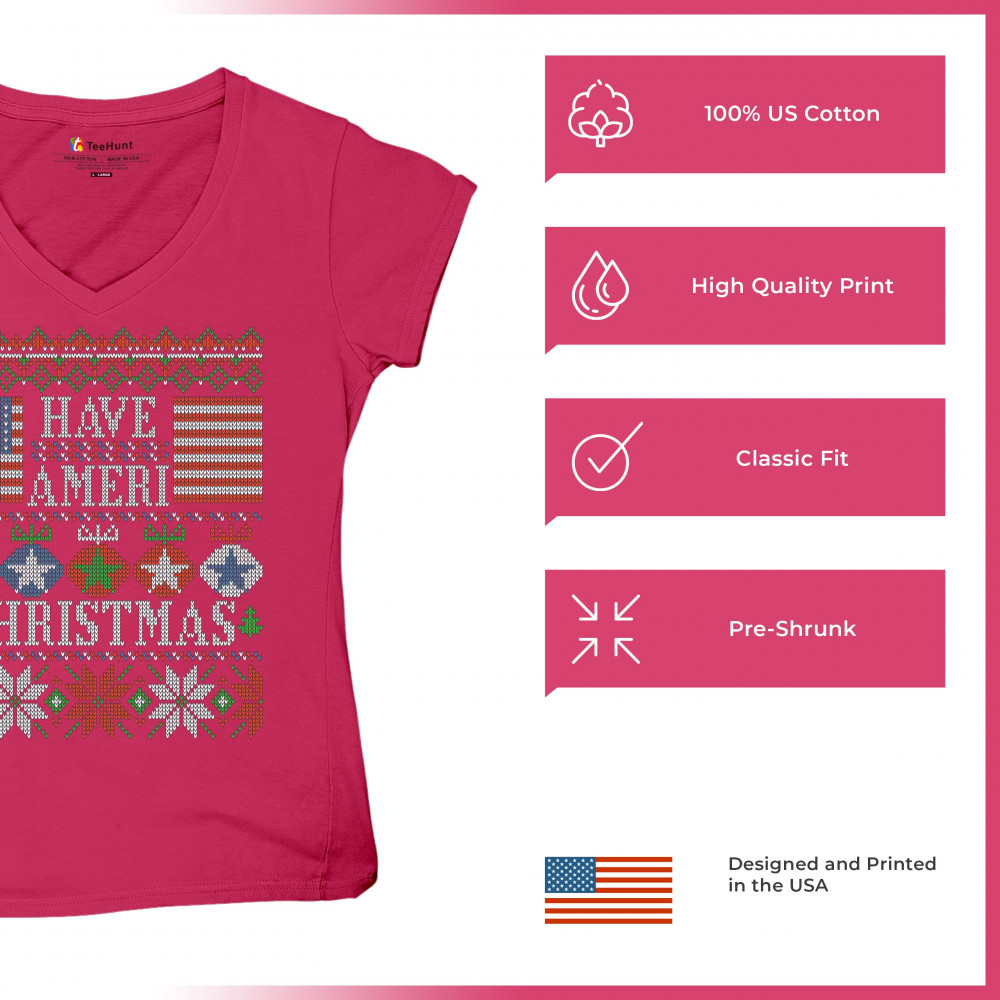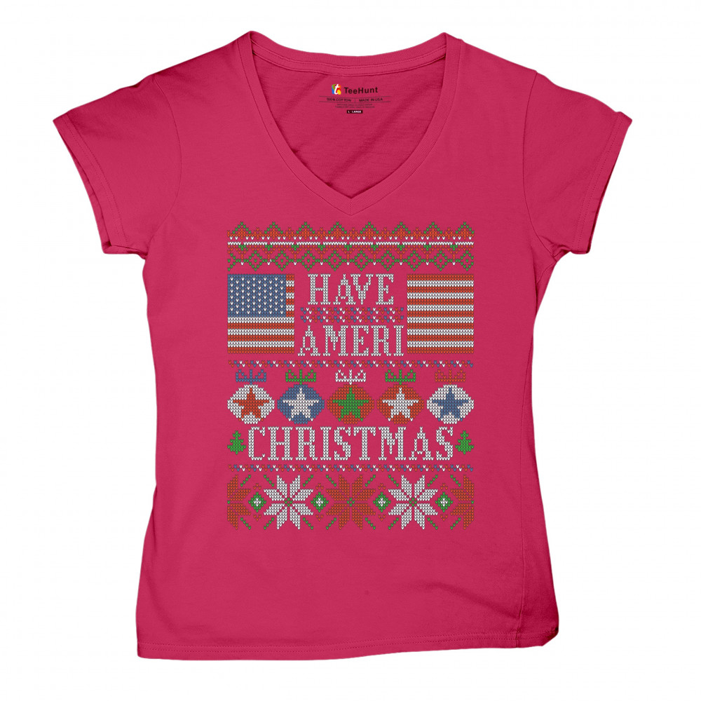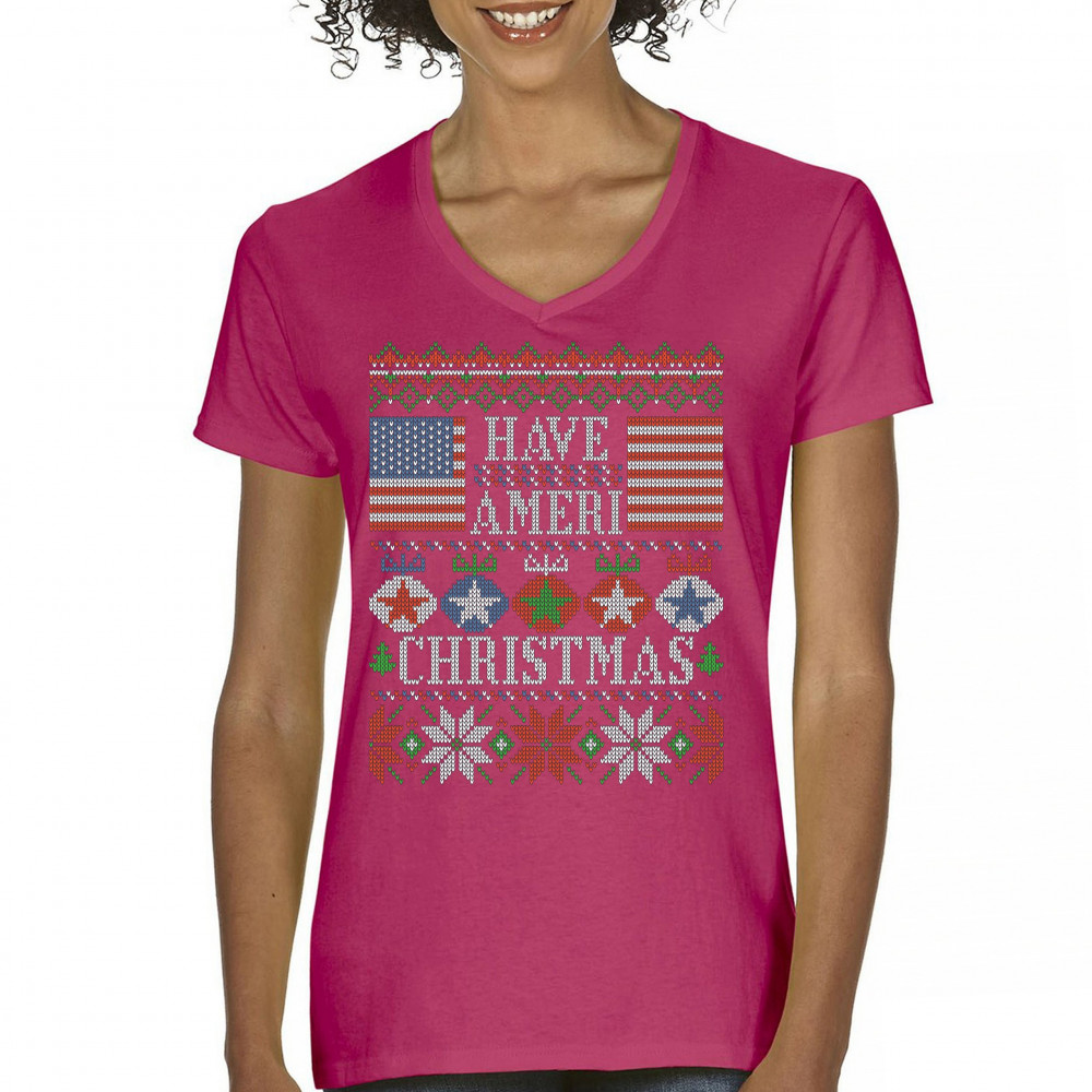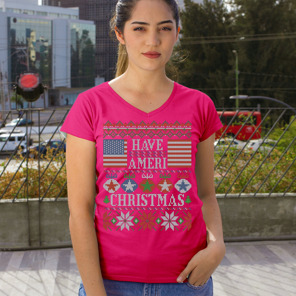 HAVE AMERI CHRISTMAS women's v-neck t-shirt american flag ugly sweater tee pink