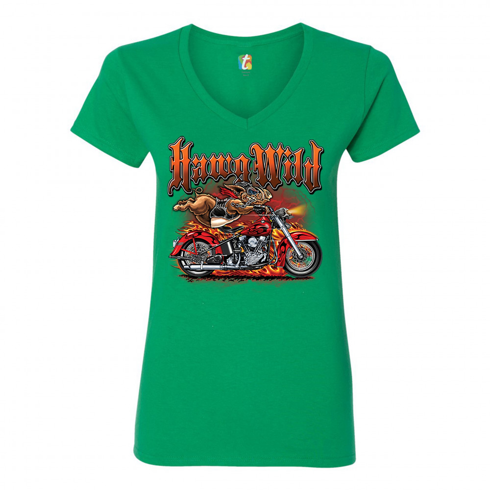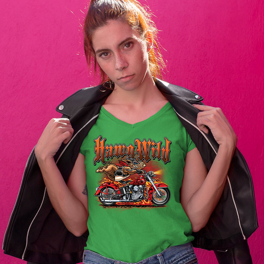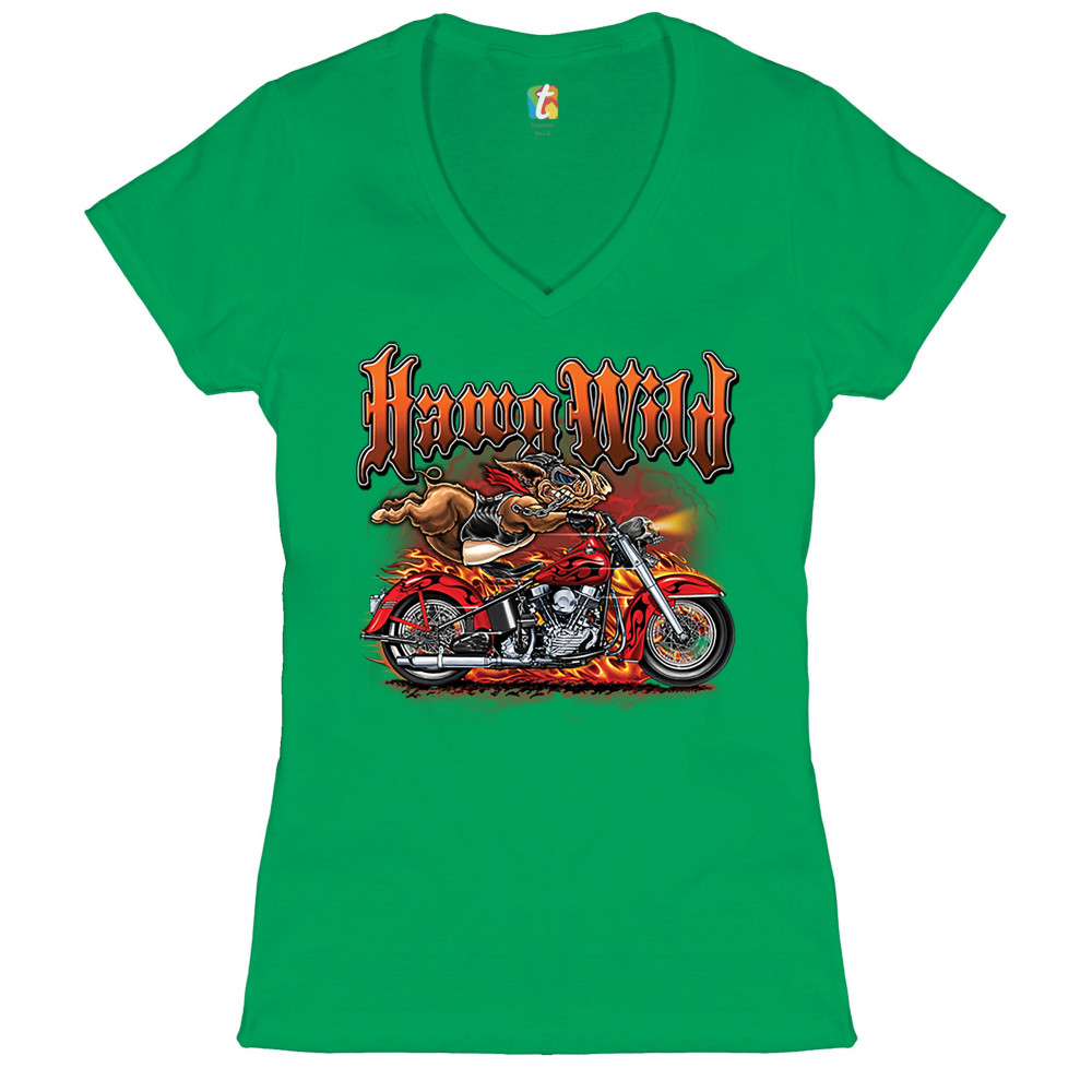 A print featuring a warthog biker holding onto the handlebars of a motorcycle riding so fast, it's body is lifted from the bike. The bike is on fire and there a lightning strikes in the background. The print says: "Hawg Wild". A great choice for a motorcy