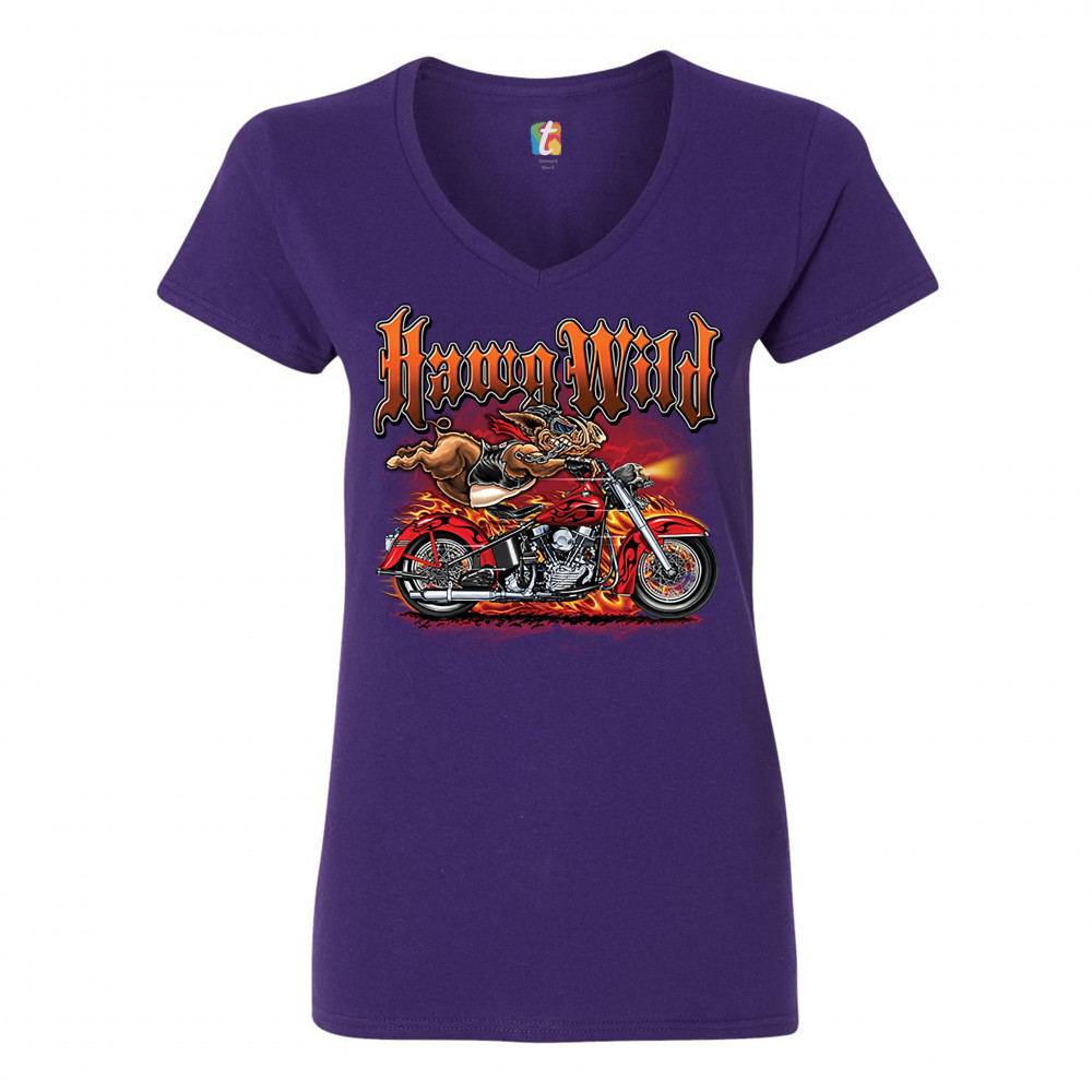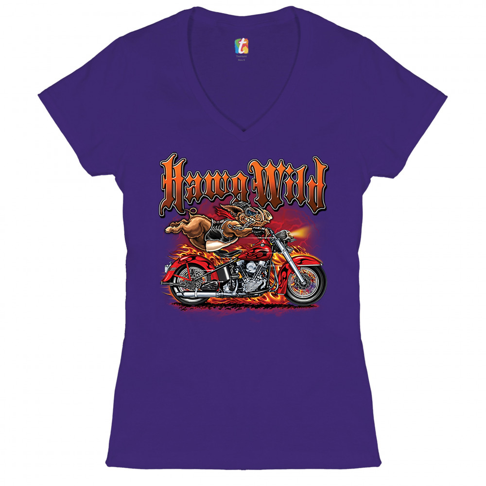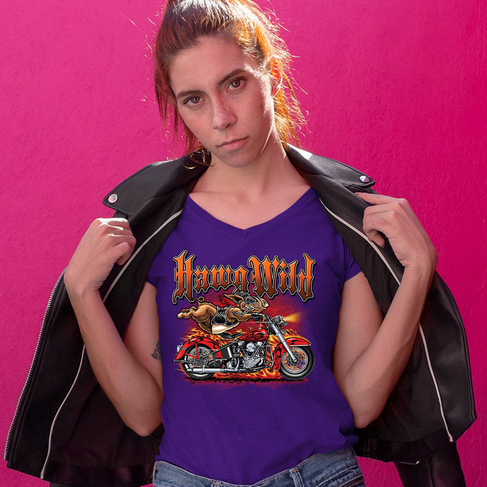 A print featuring a warthog biker holding onto the handlebars of a motorcycle riding so fast, it's body is lifted from the bike. The bike is on fire and there a lightning strikes in the background. The print says: "Hawg Wild". A great choice for a motorcy