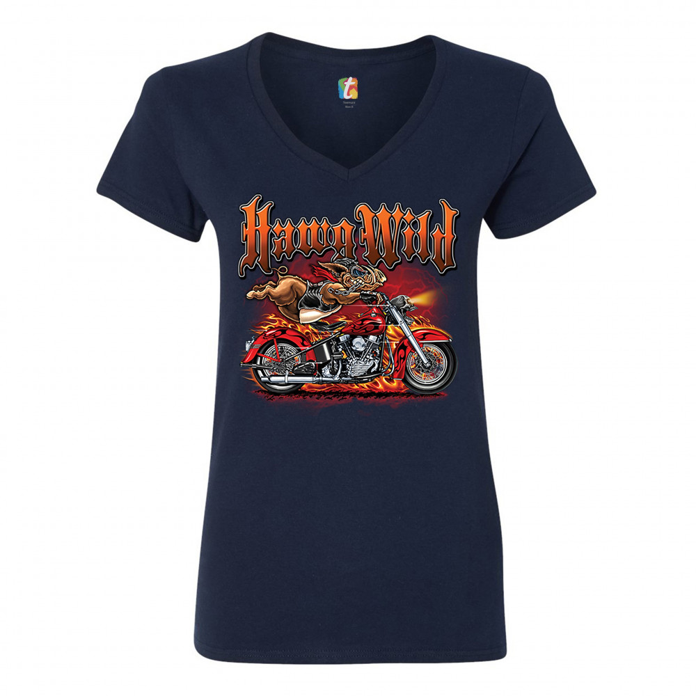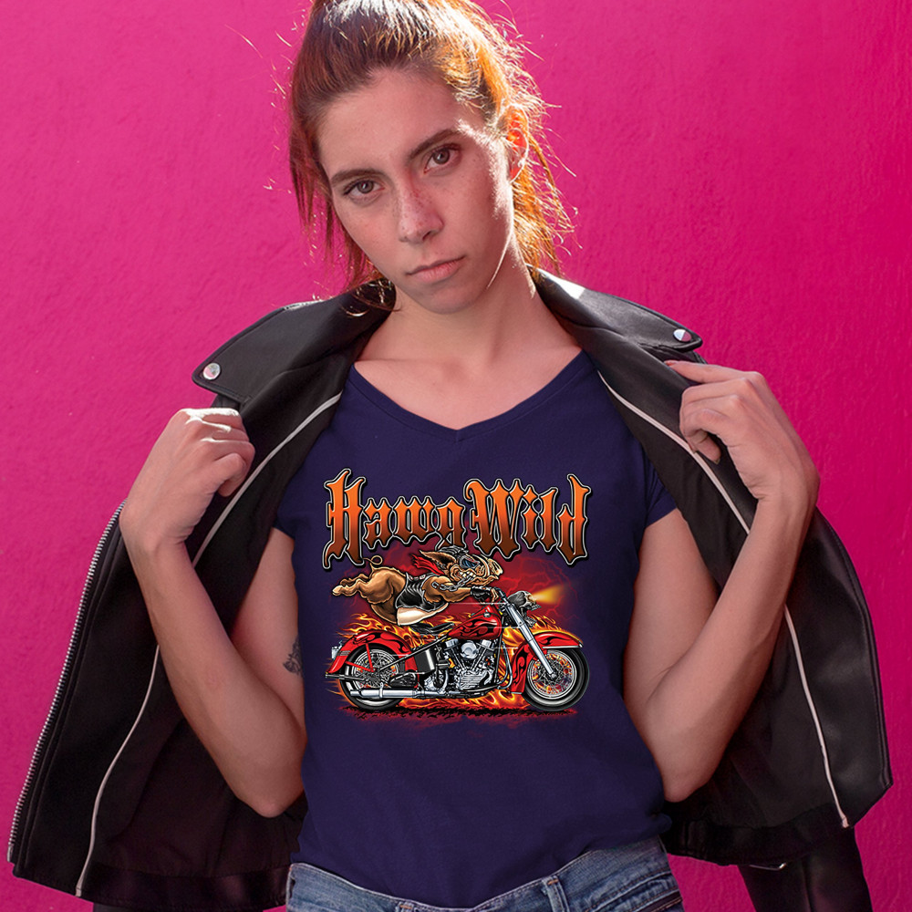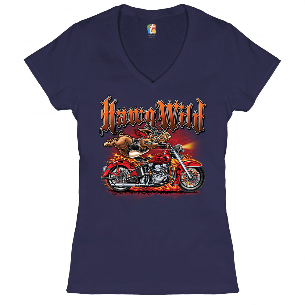 HAWG WILD women's v-neck t-shirt born to be wild biker rider motorcycle tee navy blue
