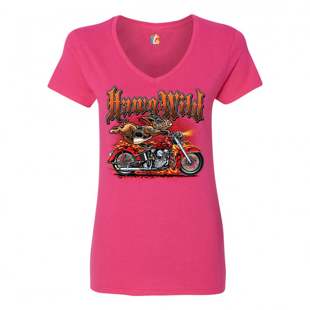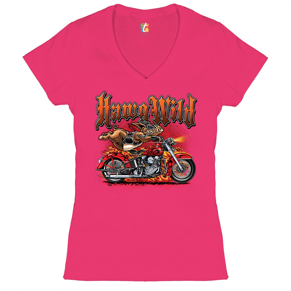 A print featuring a warthog biker holding onto the handlebars of a motorcycle riding so fast, it's body is lifted from the bike. The bike is on fire and there a lightning strikes in the background. The print says: "Hawg Wild". A great choice for a motorcy