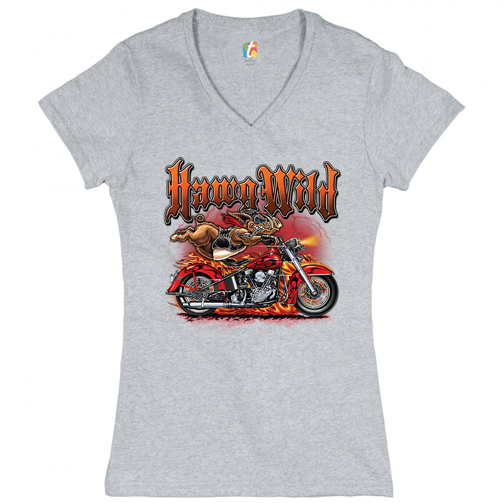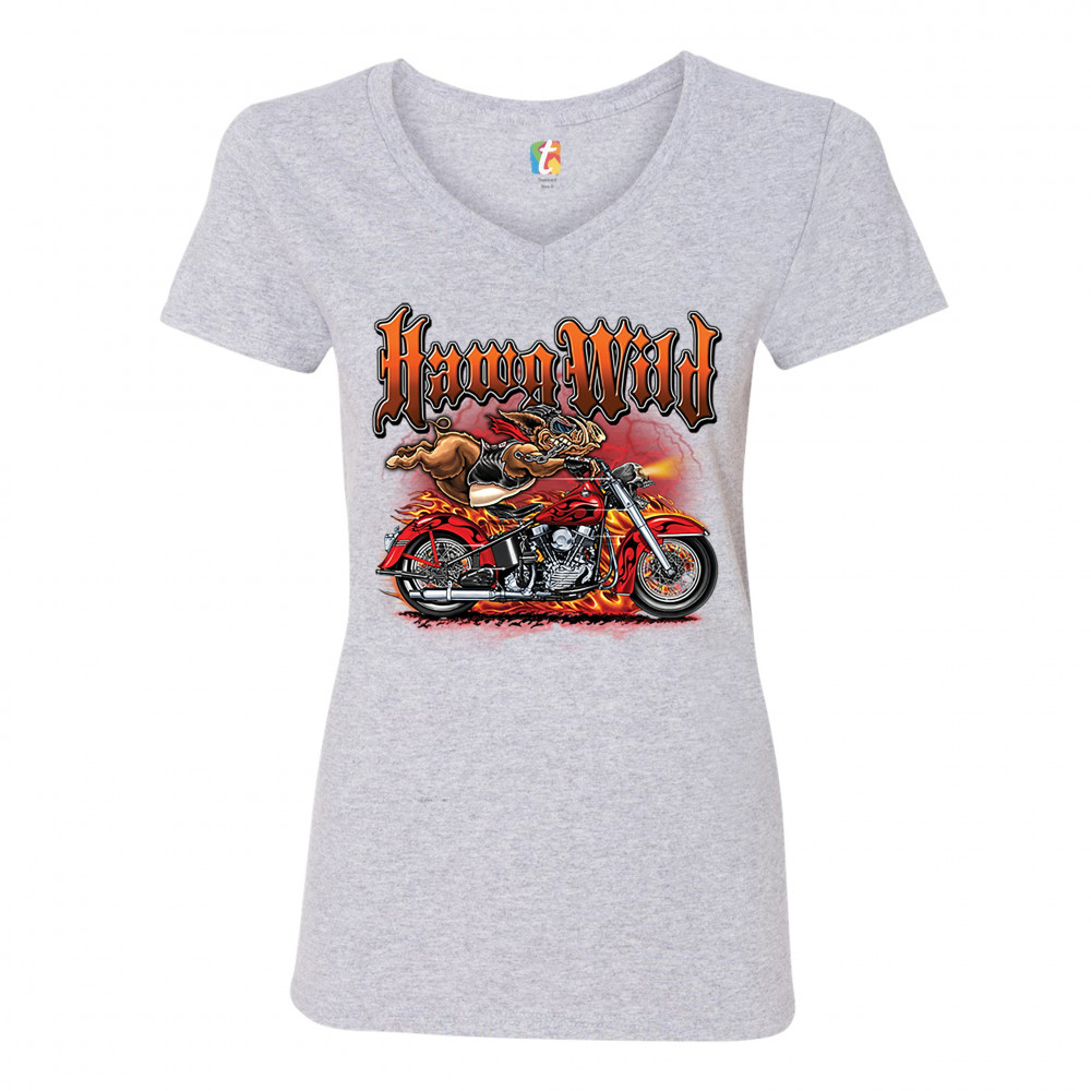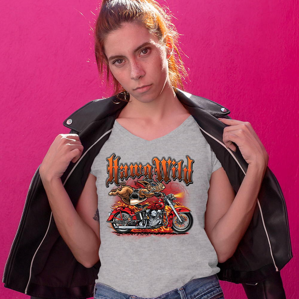 A print featuring a warthog biker holding onto the handlebars of a motorcycle riding so fast, it's body is lifted from the bike. The bike is on fire and there a lightning strikes in the background. The print says: "Hawg Wild". A great choice for a motorcy