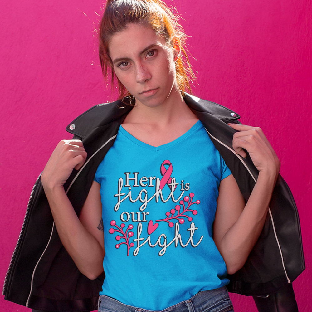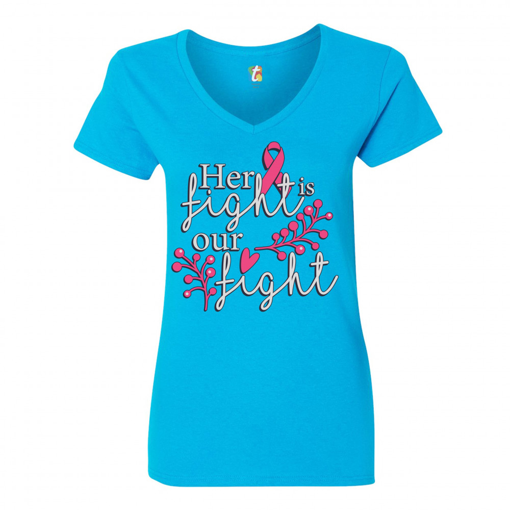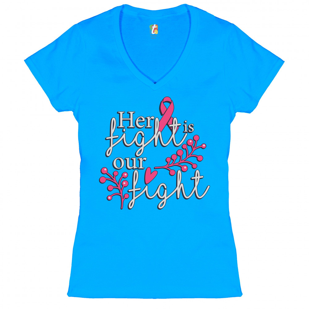 HER FIGHT IS OUR FIGHT women's v-neck t-shirt breast cancer pink ribbon tee turquoise