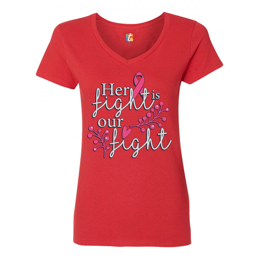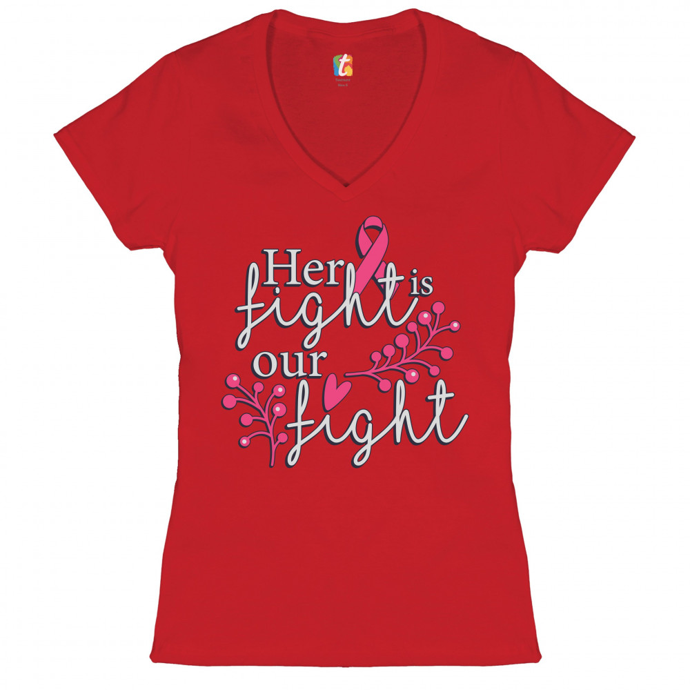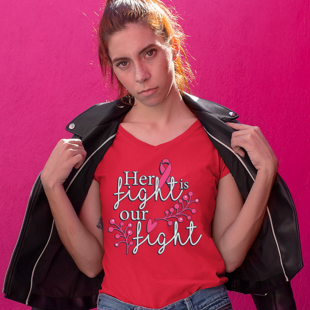 HER FIGHT IS OUR FIGHT women's v-neck t-shirt breast cancer pink ribbon tee red