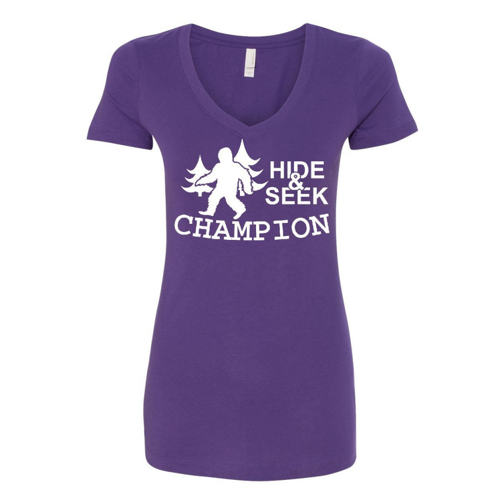 HIDE AND SEEK CHAMPION women's v-neck t-shirt bigfoot yeti funny humor purple