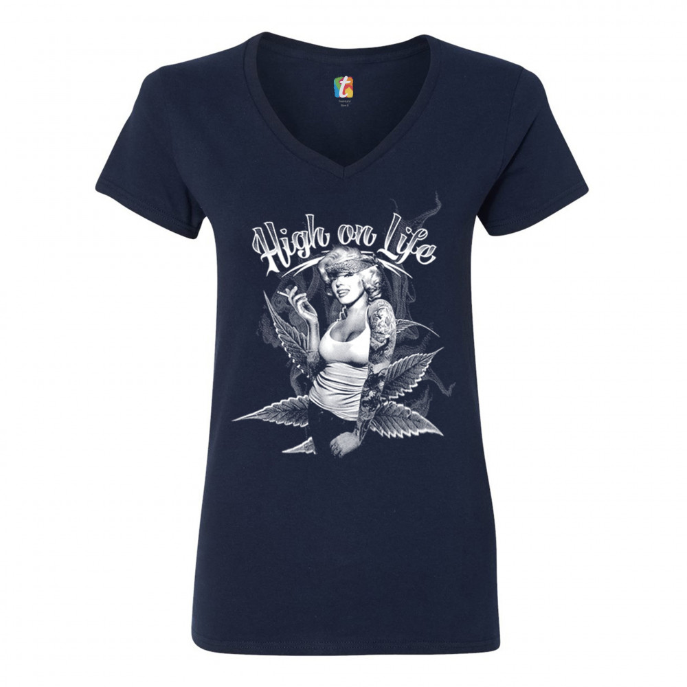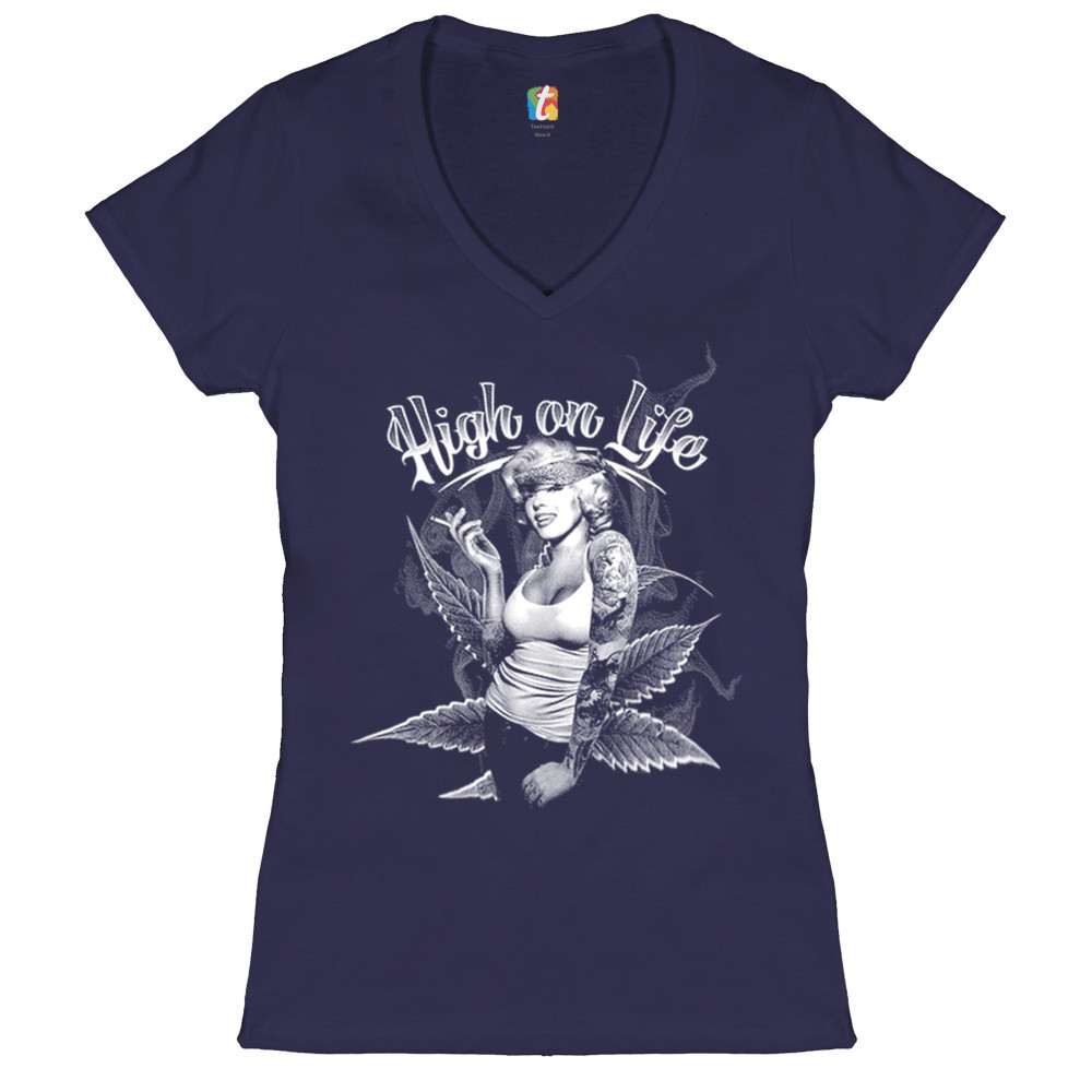 HIGH ON LIFE women's v-neck t-shirt marilyn monroe holding a joint 420 tee navy blue