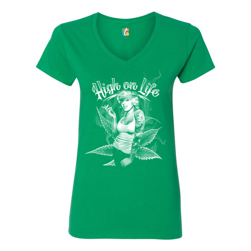 HIGH ON LIFE women's v-neck t-shirt marilyn monroe holding a joint 420 tee green
