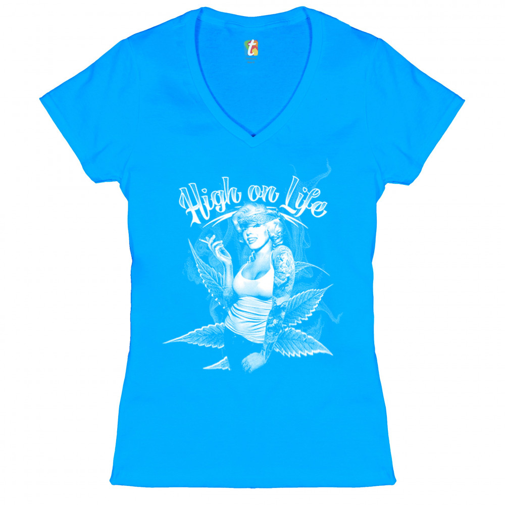 HIGH ON LIFE women's v-neck t-shirt marilyn monroe holding a joint 420 tee turquoise
