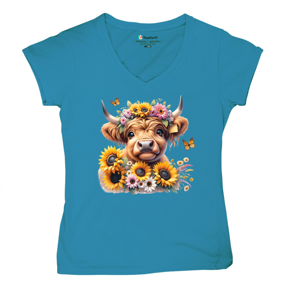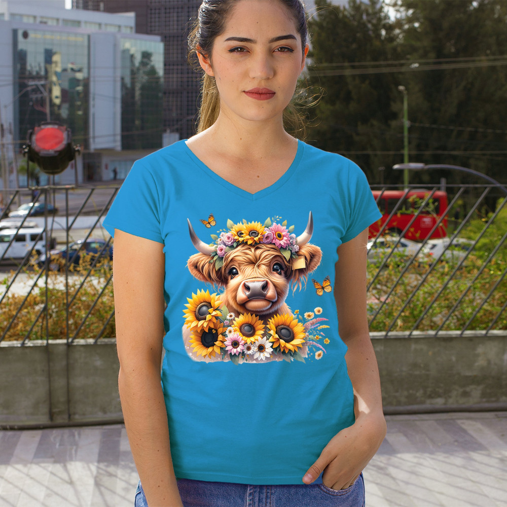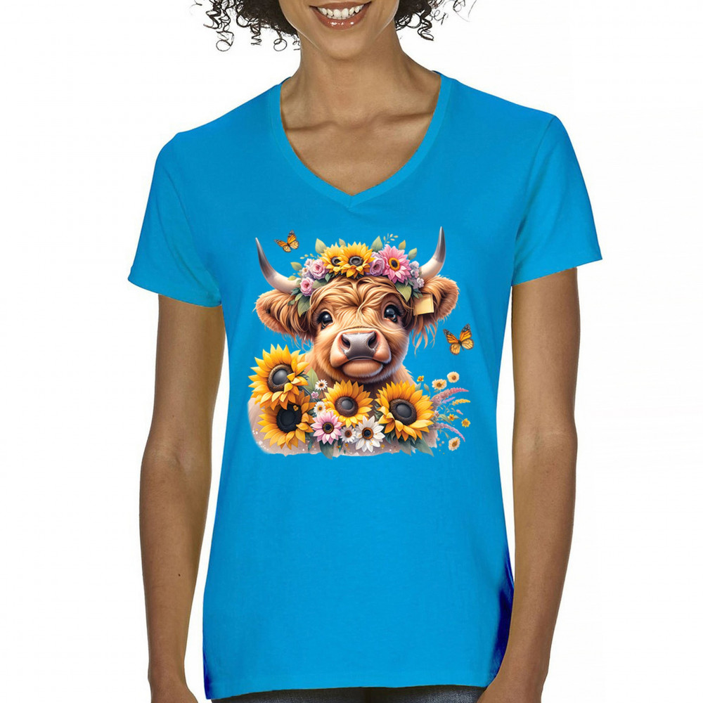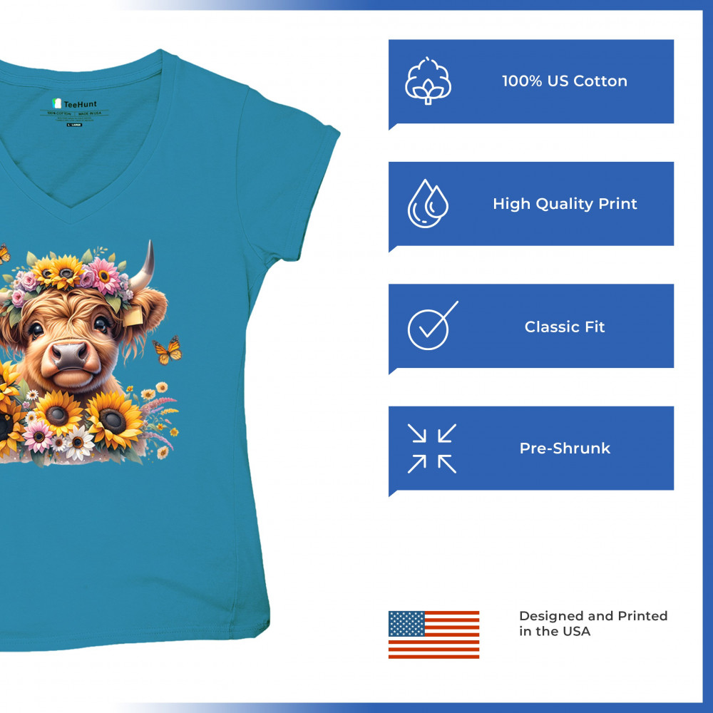 Highland Cow floral design with sunflowers and daisies, rustic farmhouse cow style, western ranch boho charm, and cozy country farmhouse shirt vibes.