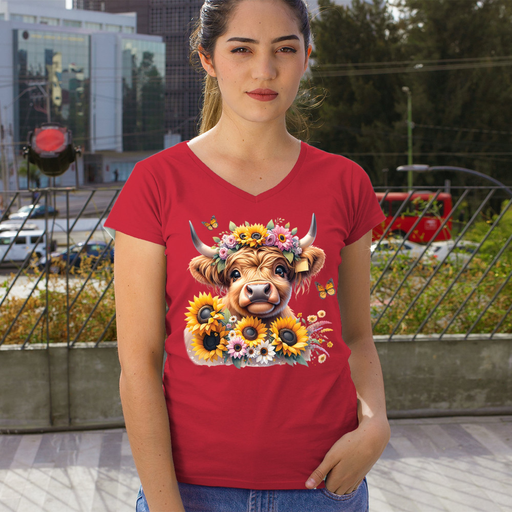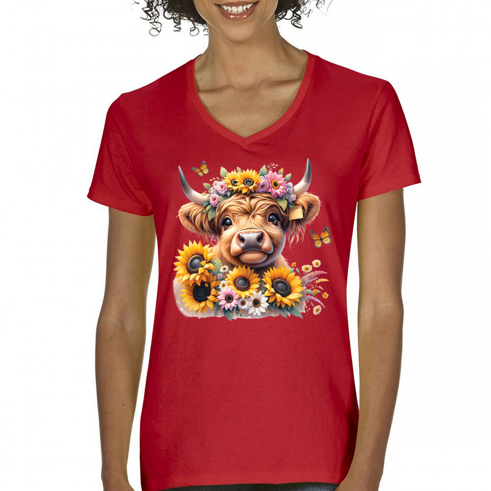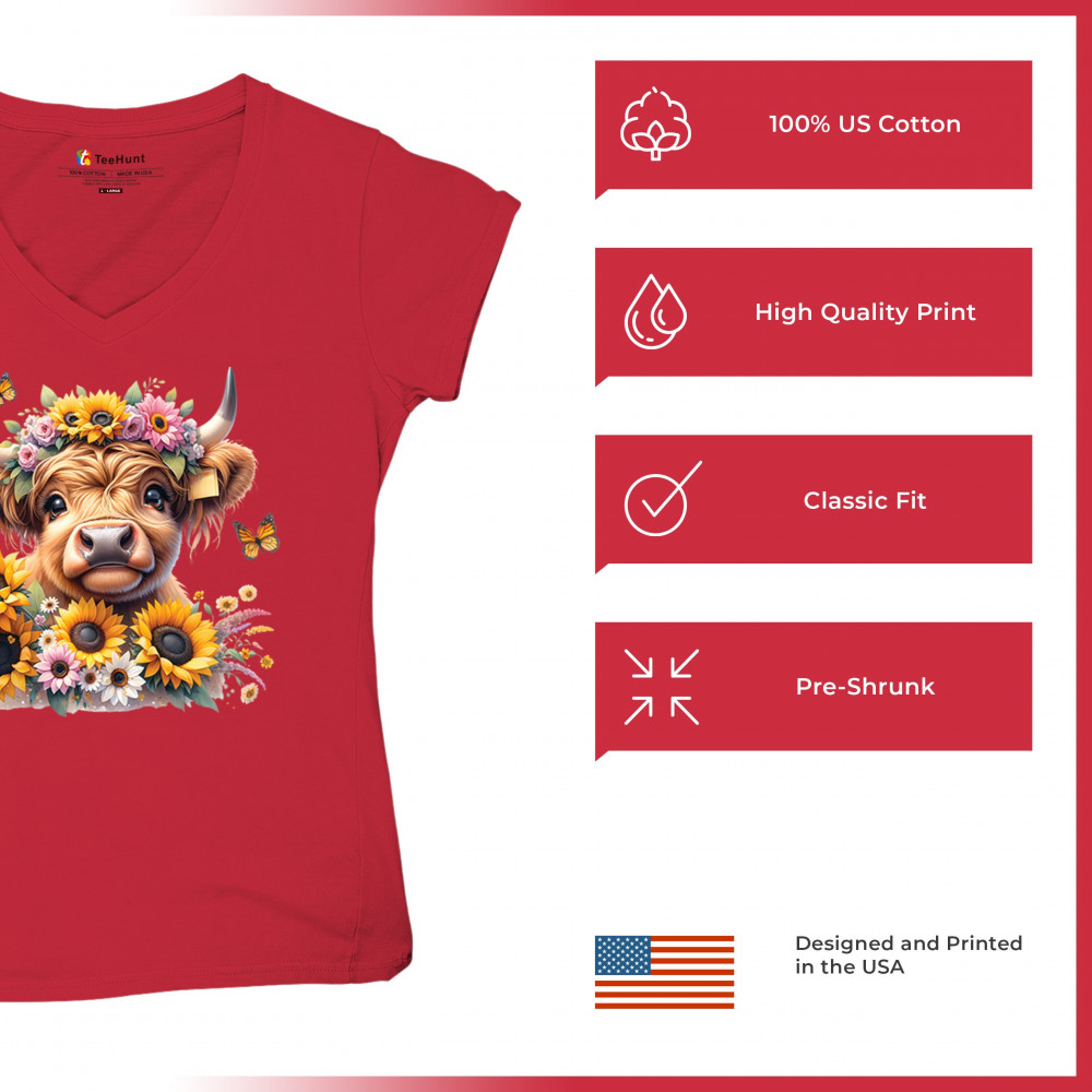 Highland Cow floral design with sunflowers and daisies, rustic farmhouse cow style, western ranch boho charm, and cozy country farmhouse shirt vibes.
