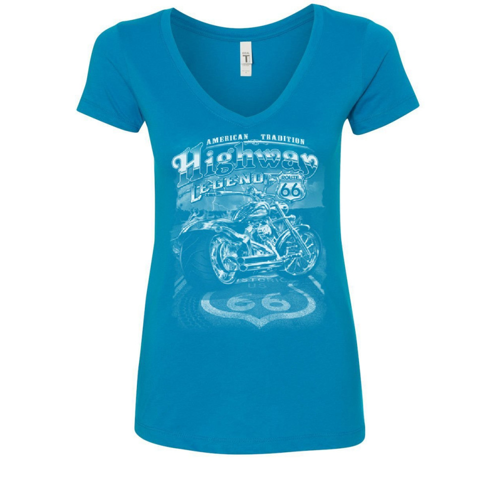 HIGHWAY LEGEND ROUTE 66 women's v-neck t-shirt biker american tradition chopper turquoise