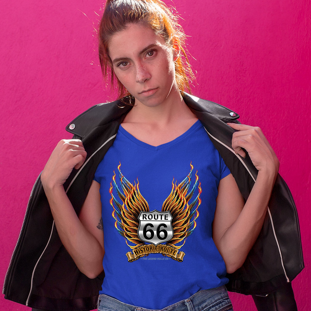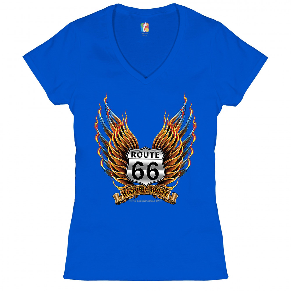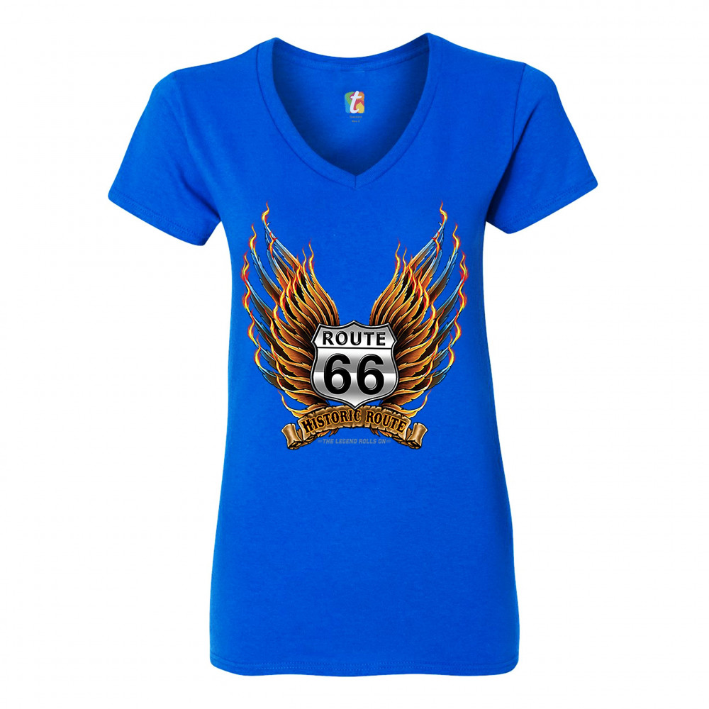 HISTORIC ROUTE 66 women's v-neck t-shirt the legend rolls on mother road tee royal blue