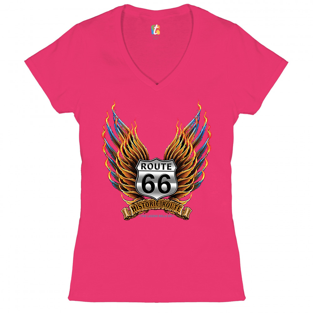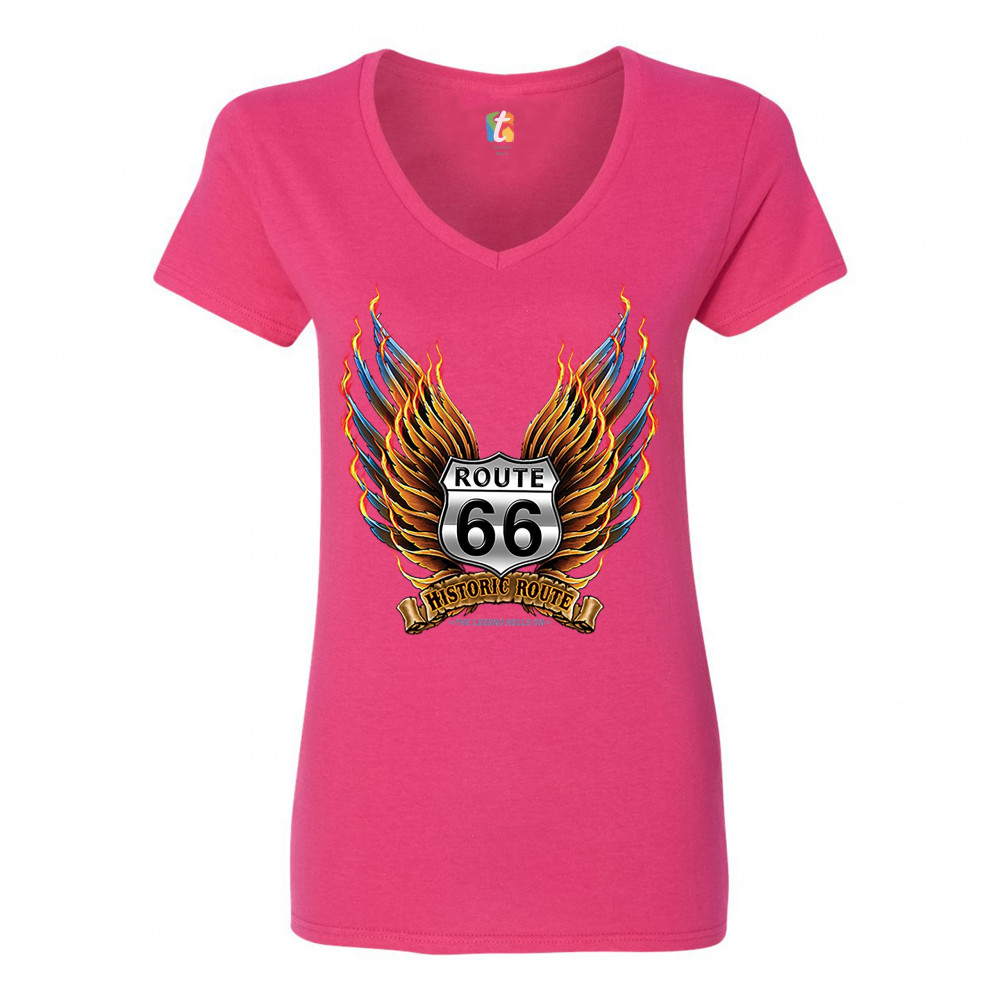 HISTORIC ROUTE 66 women's v-neck t-shirt the legend rolls on mother road tee pink