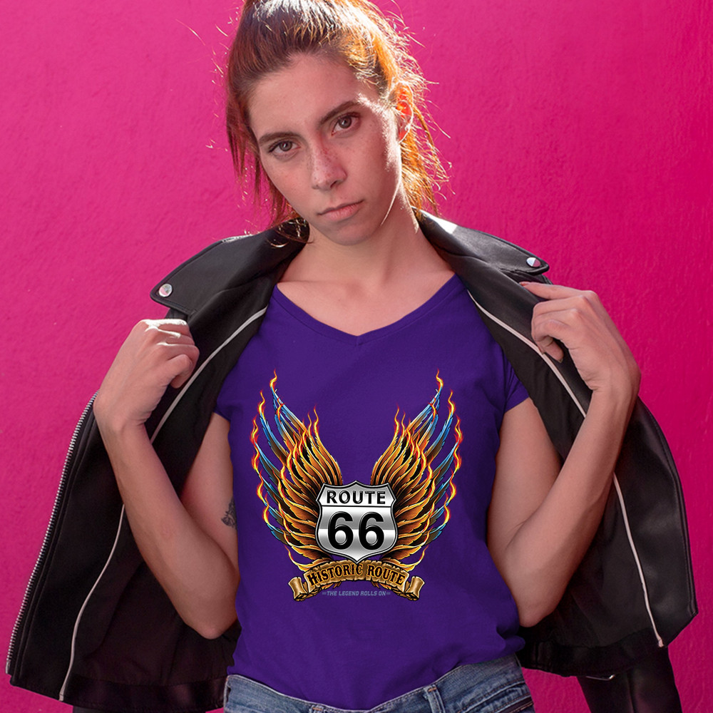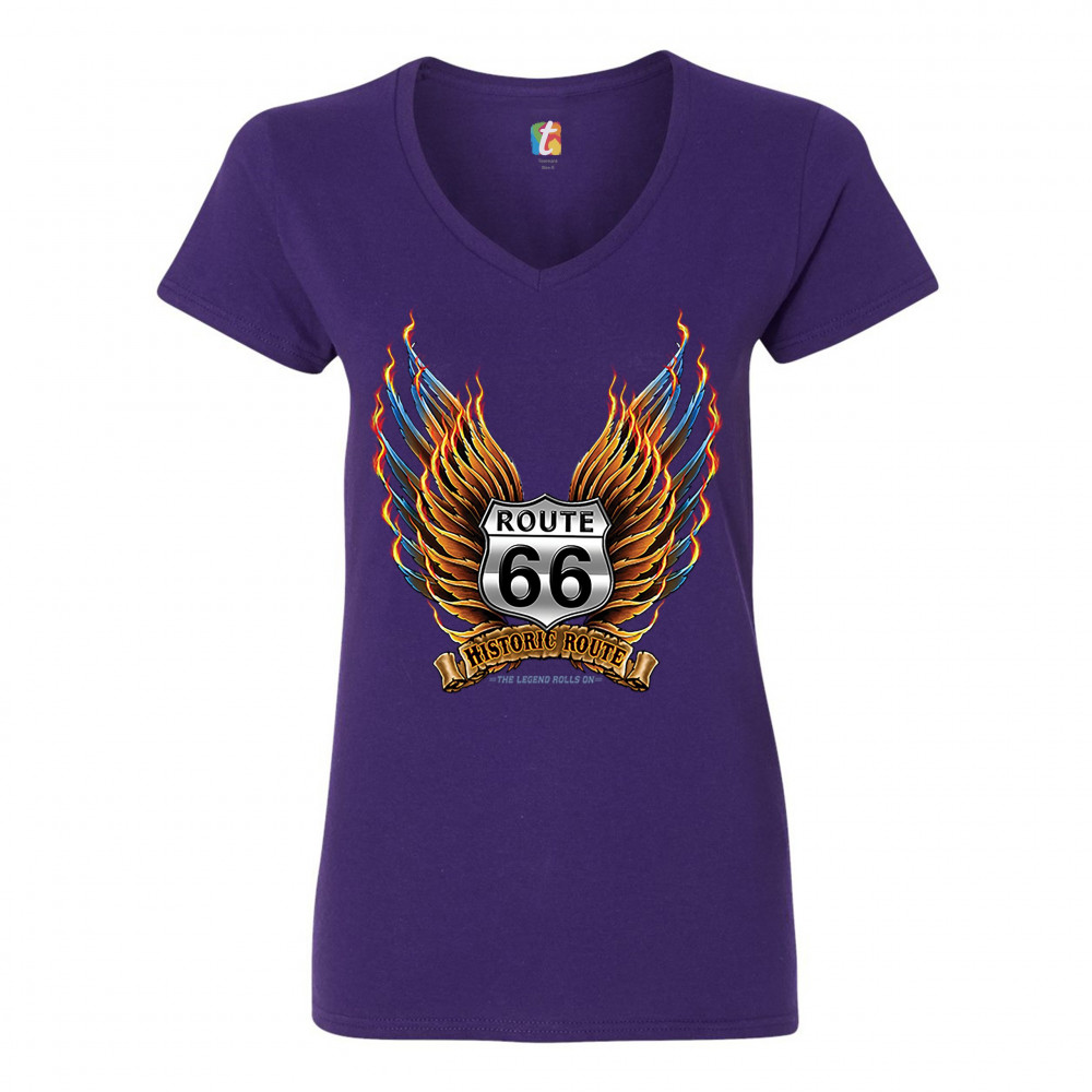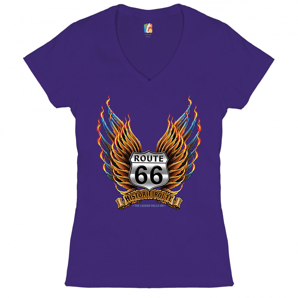 HISTORIC ROUTE 66 women's v-neck t-shirt the legend rolls on mother road tee purple