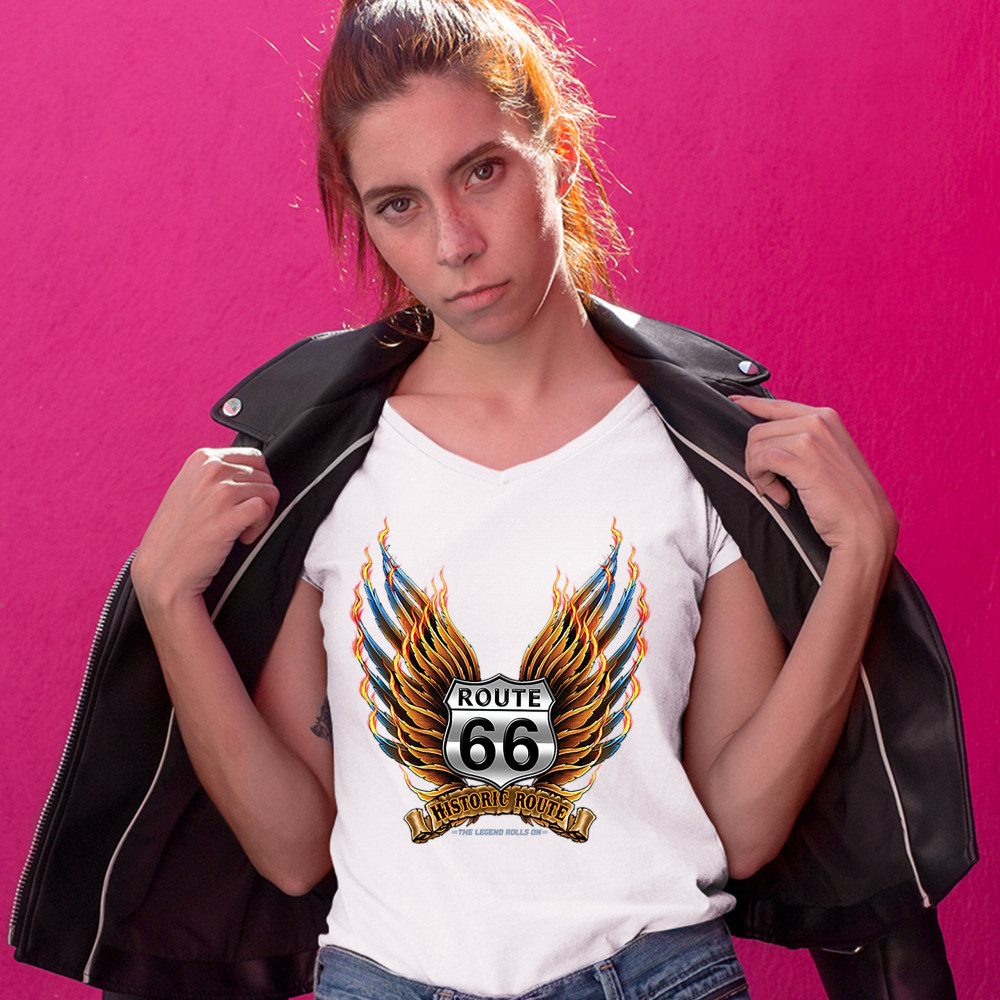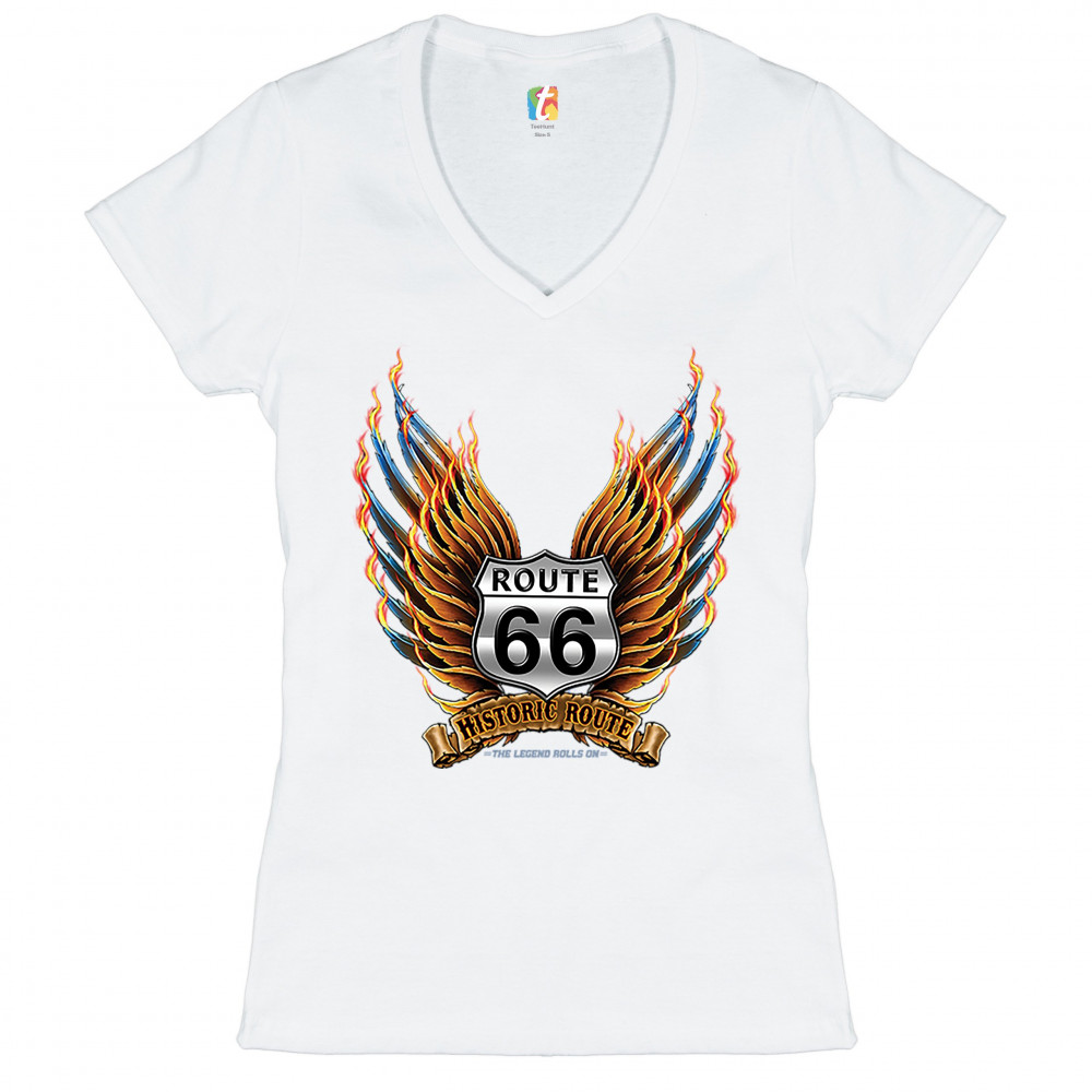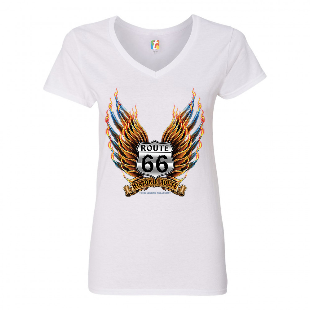 HISTORIC ROUTE 66 women's v-neck t-shirt the legend rolls on mother road tee white
