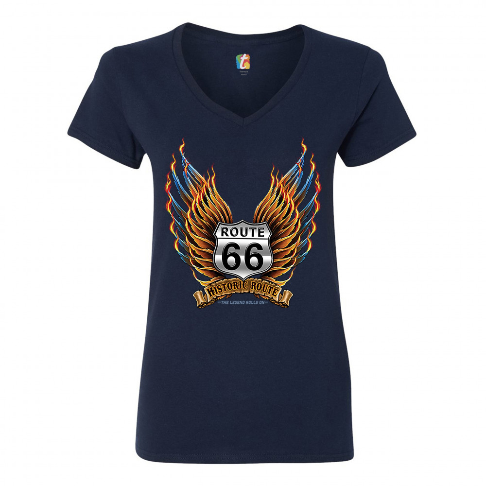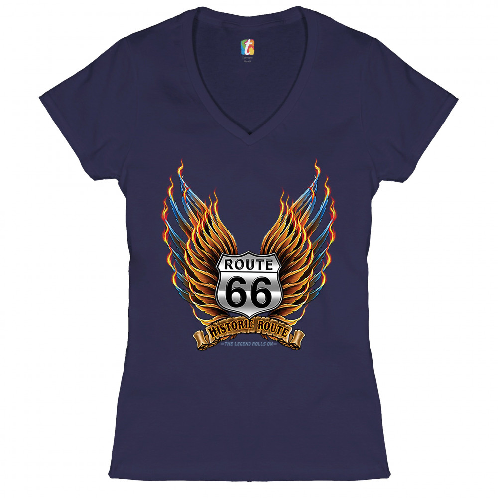 HISTORIC ROUTE 66 women's v-neck t-shirt the legend rolls on mother road tee navy blue