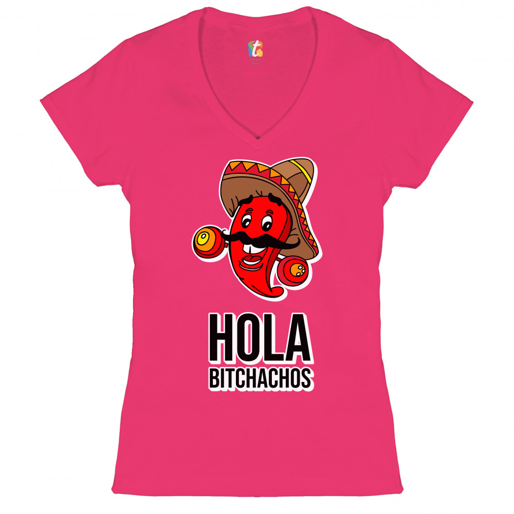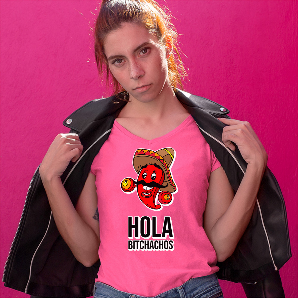 HOLA BITCHACHOS women's v-neck t-shirt mexican chili pepper cinco de mayo tee pink